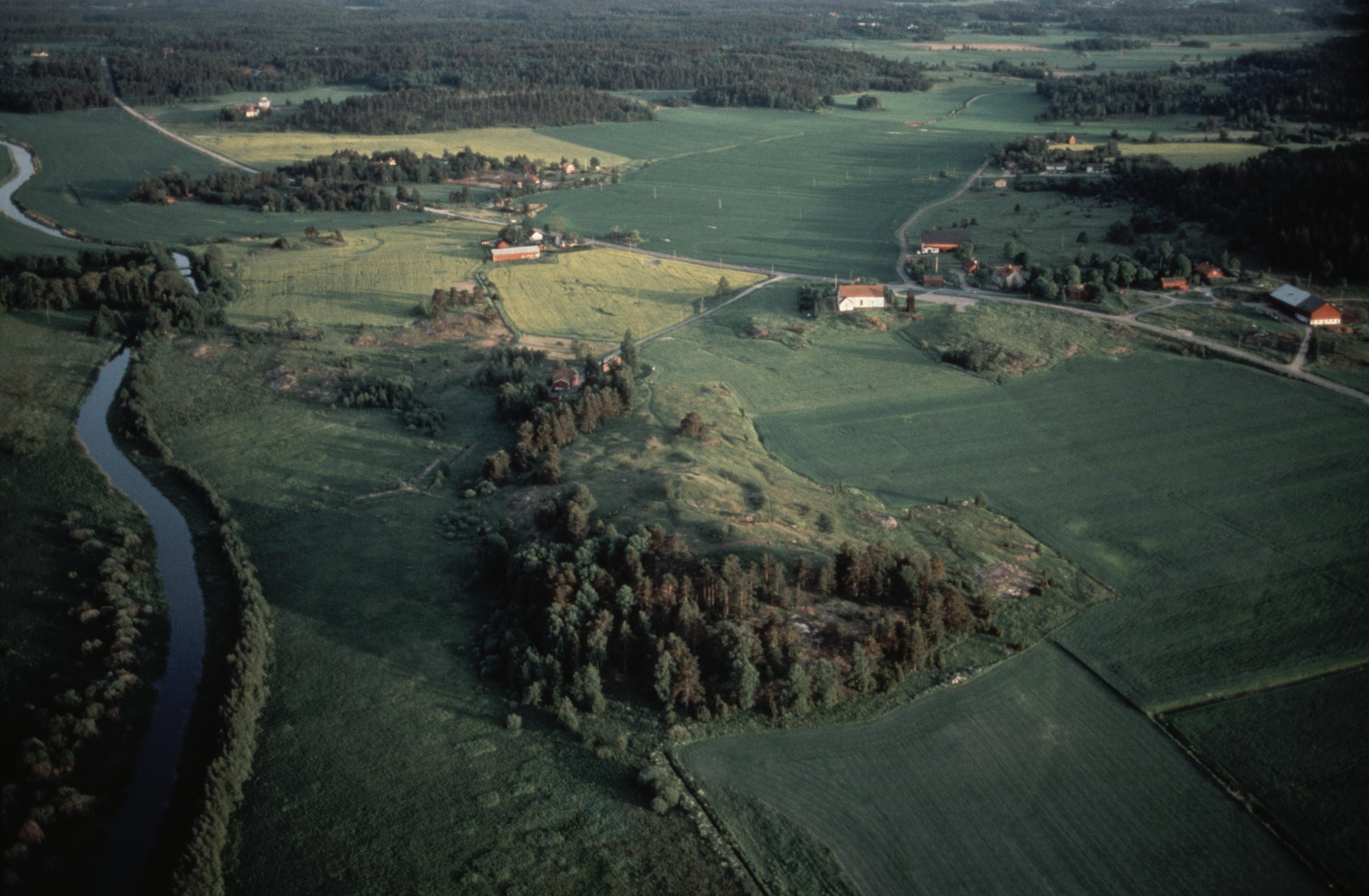 Beskrivning: Helgöåns dalgång i Långhundraleden. Ån markerar gränsen mot socknet Össeby-Garn (i bildens vänstra kant). Vid bildens mitt gravfältet Sjökullarna RAÄnr Vada 10:1. I bildens övre del Vada kyrka. Bilden är tagen mot (väderstreck): S