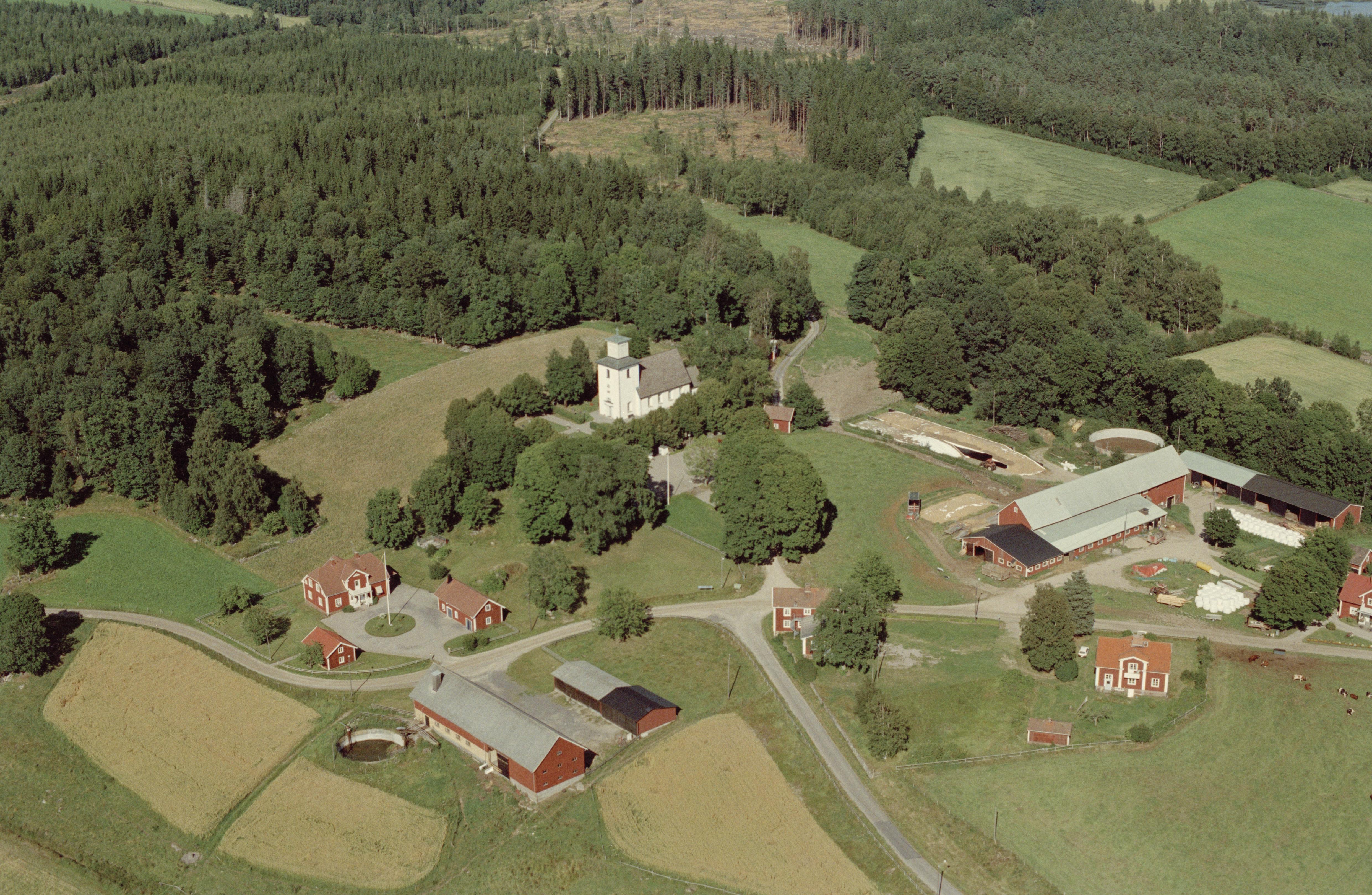 Beskrivning: Ormesberga kyrka och kyrkby. Vid bildens mitt bytomt RAÄnr Ormesberga 55:1. Bilden är tagen mot (väderstreck): NO
