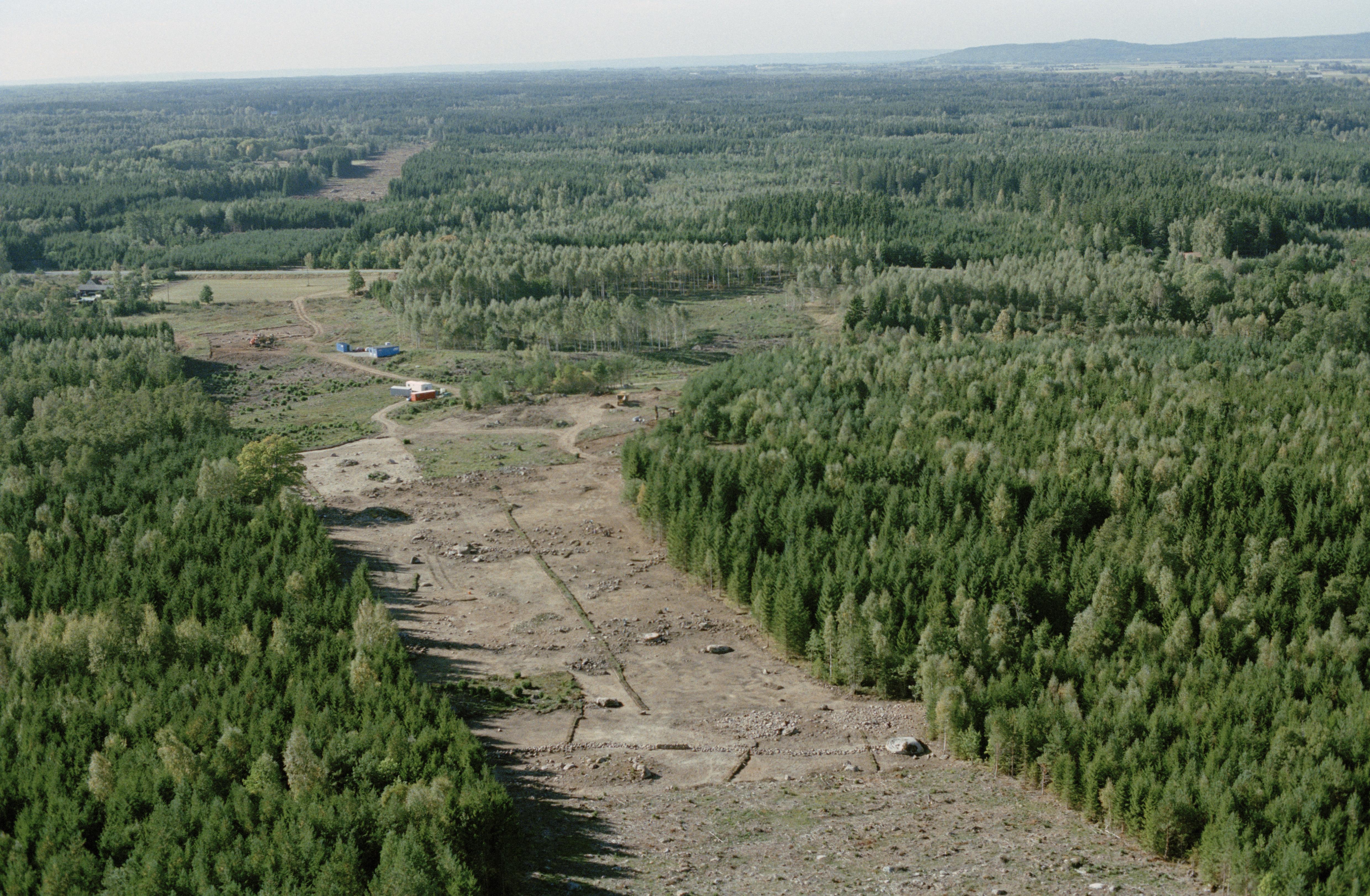 Beskrivning: Arkeologisk undersökning innan väg E4 byggs söder om tätorten Väderstad. Stensträngar RAÄnr Väderstad 172:1 och fossil åker Väderstad 245:1-2, 289:1-2 m.fl, vid trafikplats Nyhem. Bilden är tagen mot (väderstreck): VSV