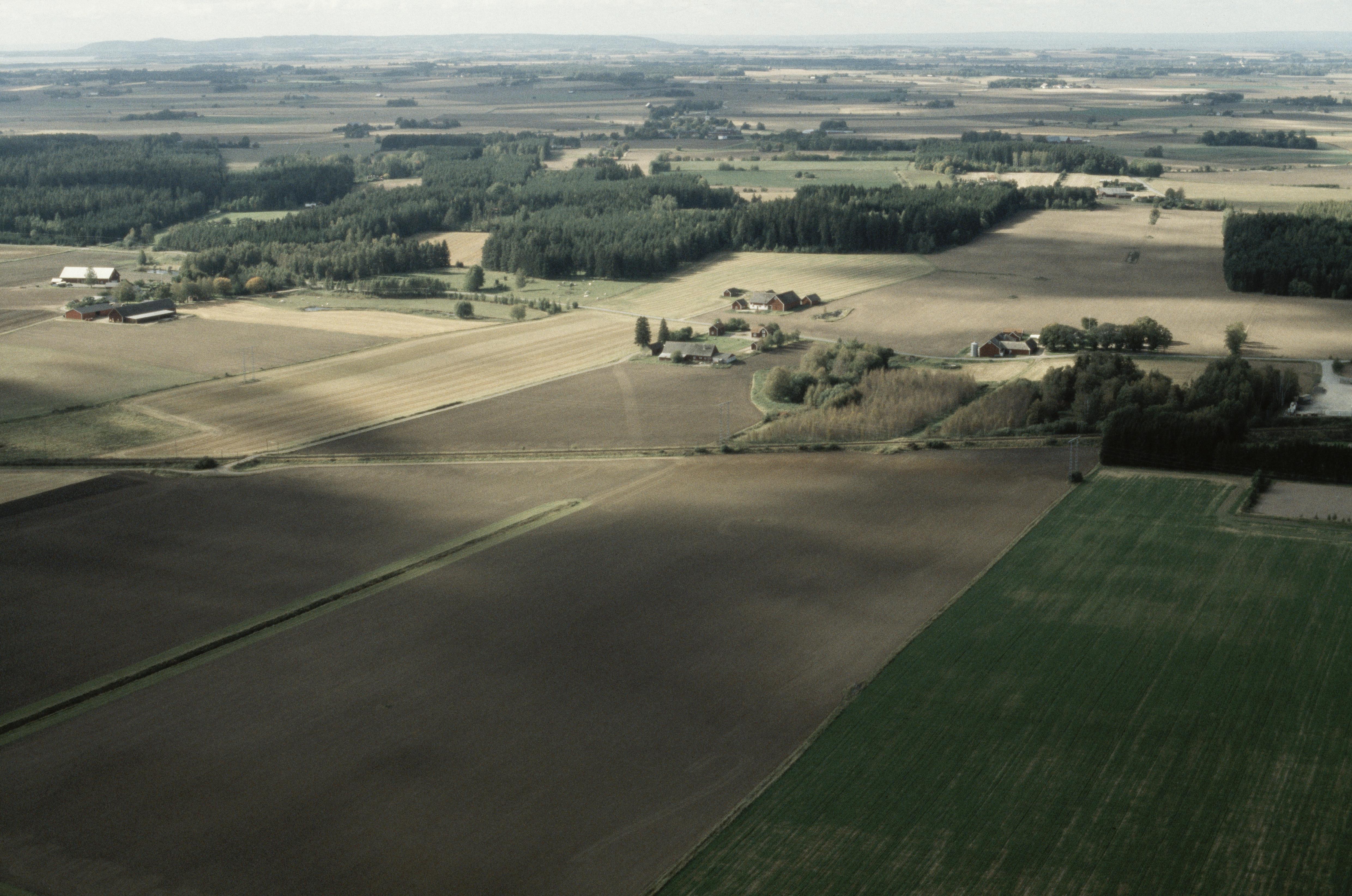 Beskrivning: Boplats RAÄnr Fivelstad 59 och fossil åker Fivelstad 72 m.fl. vid bildens mitt. Fivelstads kyrka skymtas i mitten i bildens övre del. Bilden är tagen mot (väderstreck): V