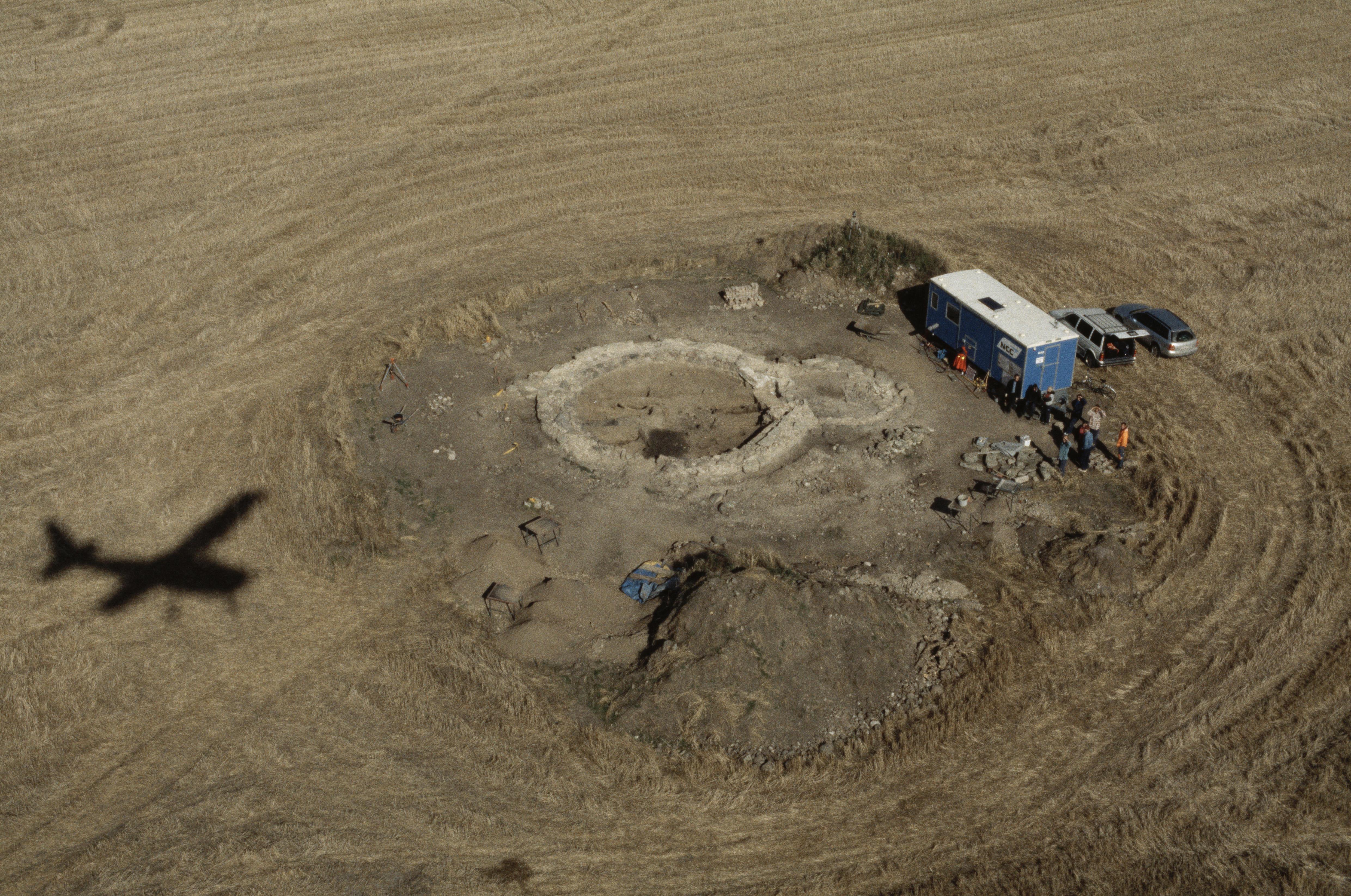 Beskrivning: Arkeologisk undersökning av Klosterstads gamla tomt och rundkyrkan (som hittades 1997) RAÄnr Sankt Per 6:1. (NB! Flygplanets skugga ses i bilden.) Bilden är tagen mot (väderstreck): NO