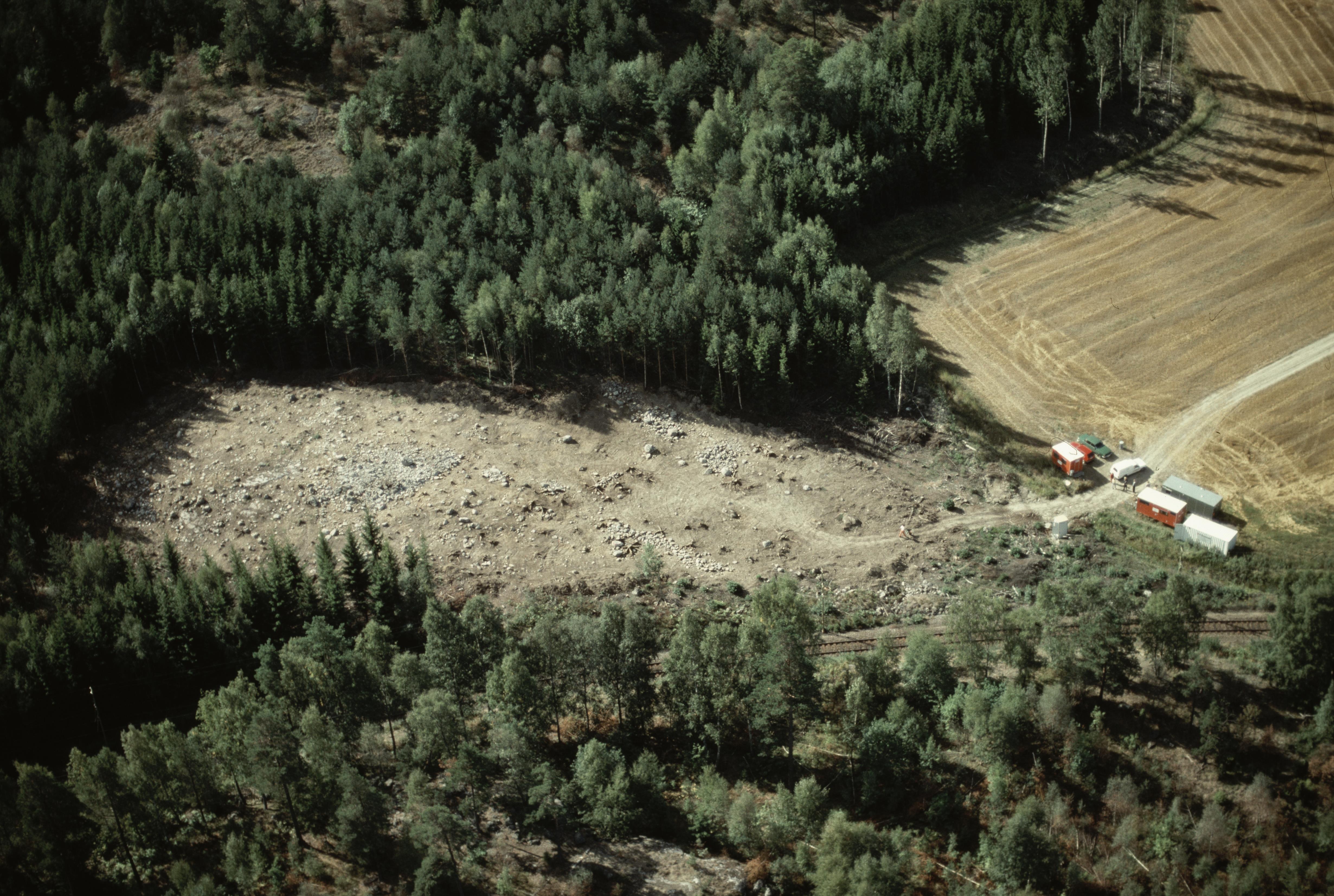 Beskrivning: Arkeologisk undersökning av boplats RAÄnr Tveta 164:1 innan järnvägen Grödingebanan byggs. I bildens nedre del den gamla järnvägssträckan. Bilden är tagen mot (väderstreck): SV