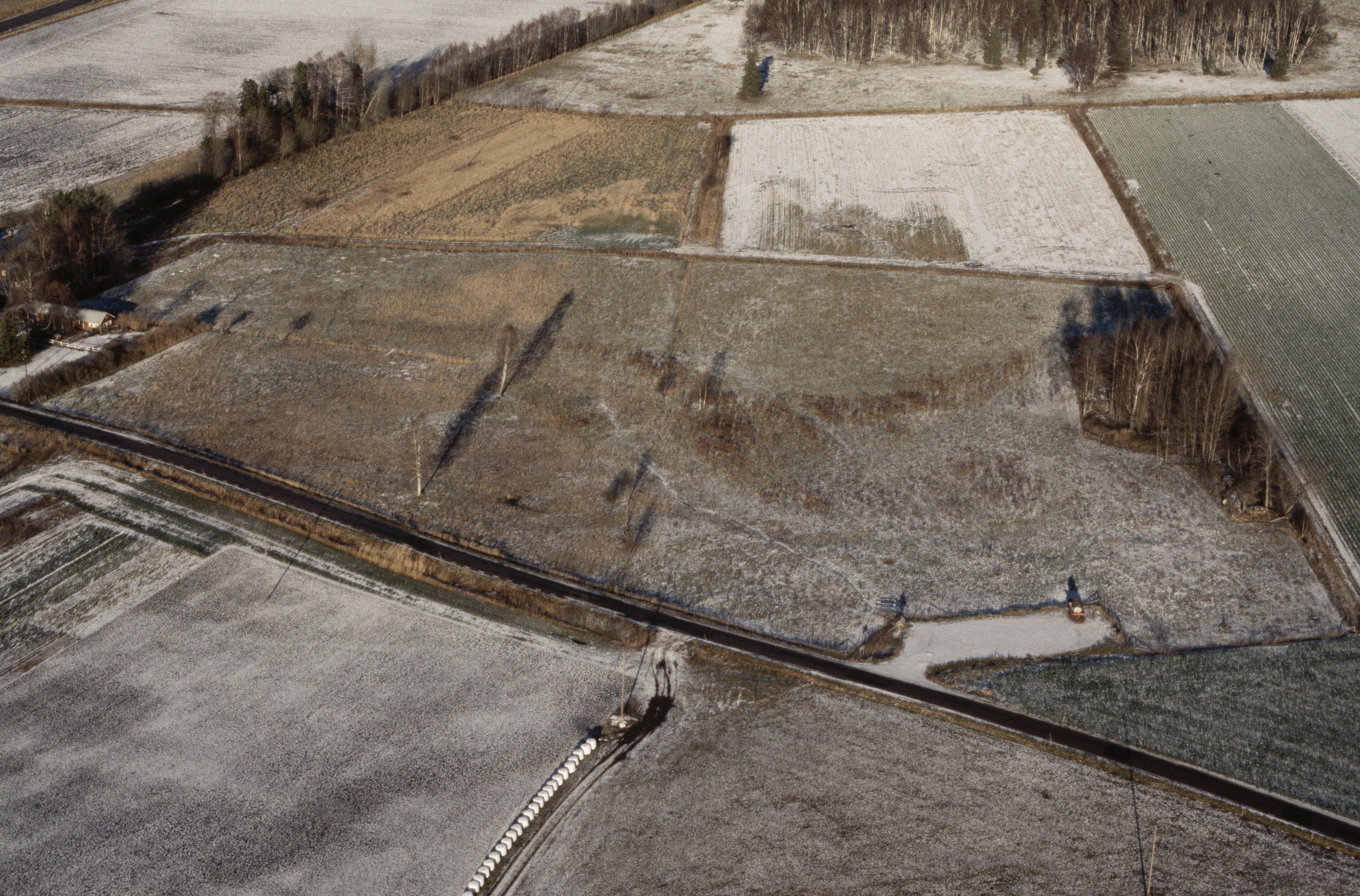Beskrivning: Stora Broby gård norröst om Alvastra kloster. Boplats RAÄnr Västra Tollstad 22:1 vid bildens mitt. Bilden är tagen mot (väderstreck): N