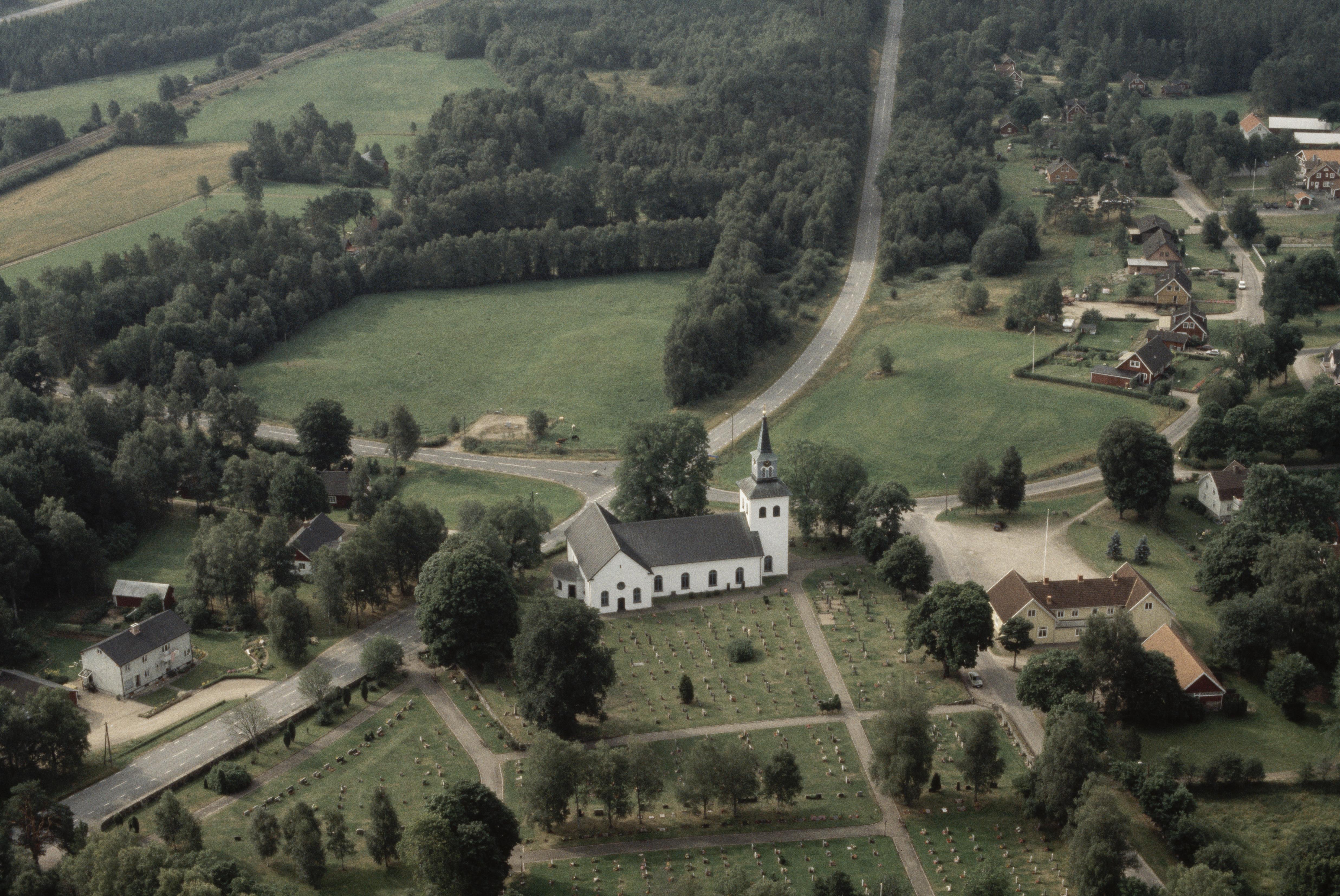 Beskrivning: Loshults kyrka och kyrkby. Bilden är tagen mot (väderstreck): SSV