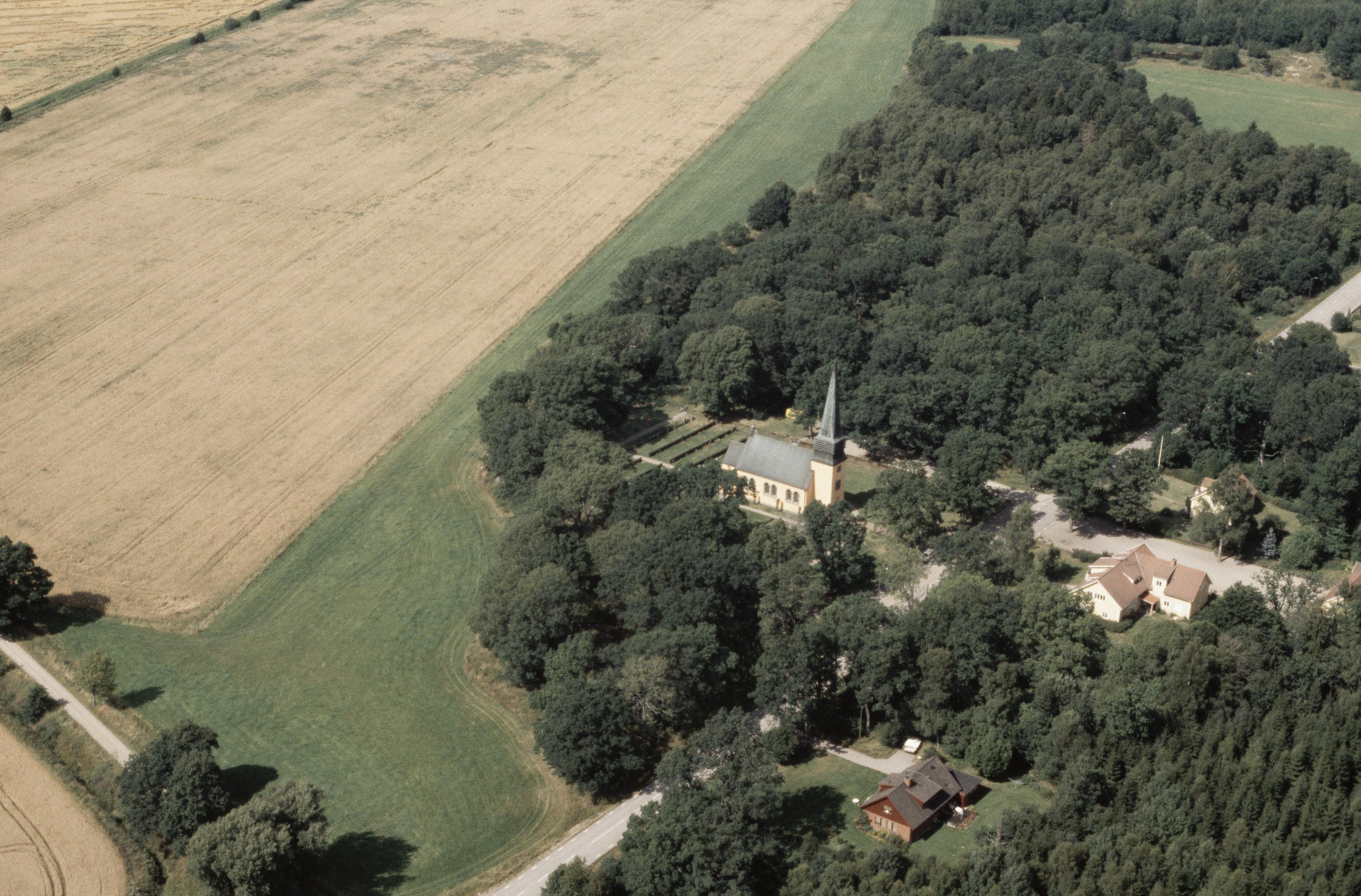 Beskrivning: Anmärkning (övrig): Riksintresse-nr/namn: G23 - Jät. Socken: Jät. Motivering: Odlingslandskap som visar kontrasten mellan herrgårds- och bondejordbruk. (Herrgårdsmiljö, Bymiljö, Kyrkomiljö, Fornlämningsmiljö). - Uttryck för riksintresset: Jätsbergs säteri från 1600-talet med nuvarande herrgård uppförd runt 1800 och med stora ekonomibyggnader, alléer och utmarkstorp samt stora fält. Kulturmarken kring byn Östra Jät, där den gamla kyrkan från 1200-talet ligger, präglas av stenmurar, odlingsrösen och brukningsvägar. Inom området finns också fornlämningar med gravfält och större rösen samt den nya kyrkan från början av 1900-talet. [Texten uppdaterat av Riksantikvarieämbetet våren 2013.] Beskrivning: Jäts nya kyrka. Bilden är tagen mot (väderstreck): NV Fotosyfte: Flygbildsdokumentation