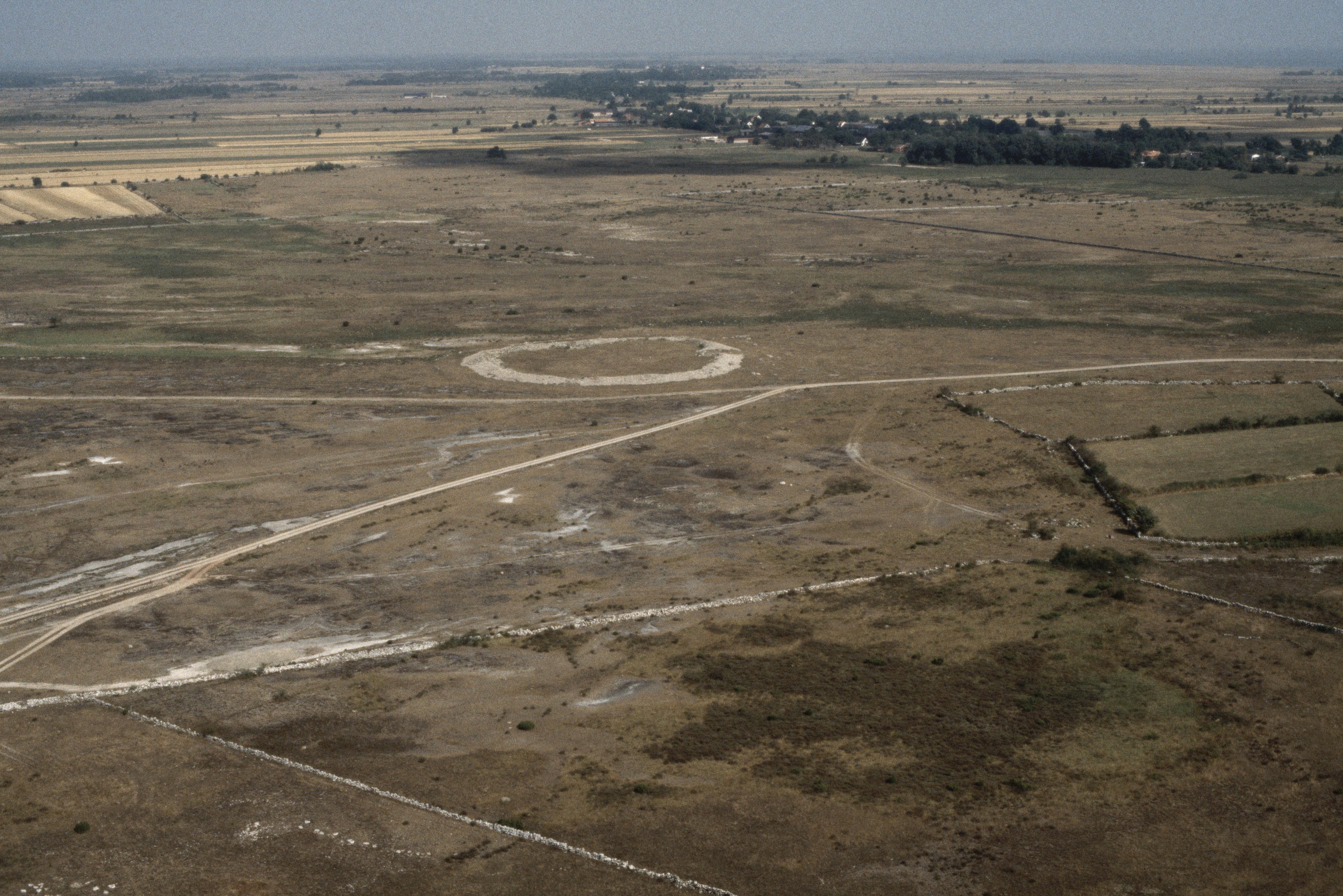 Beskrivning: Alvaret. Fornborg RAÄnr Hulterstad 20:1. I bildens övre del Triberga by. Bilden är tagen mot (väderstreck): NNO