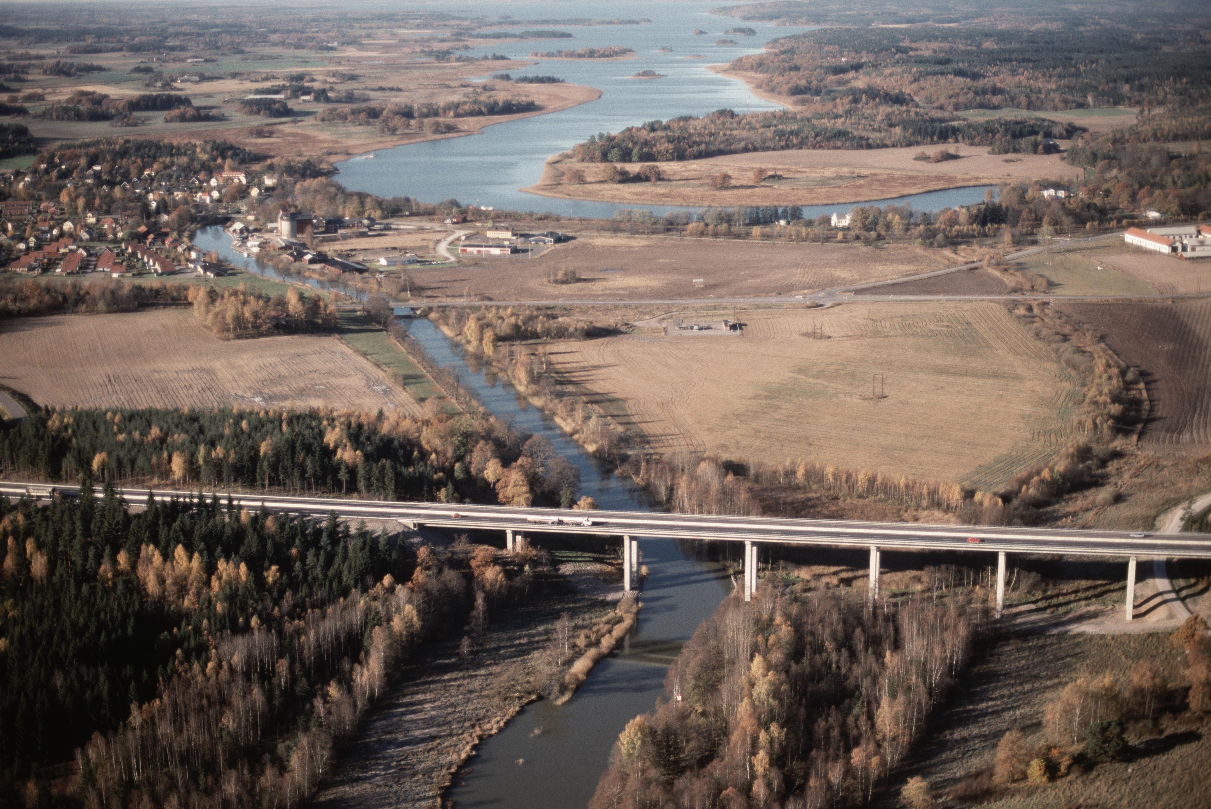 Beskrivning: Göta kanal vid tätorten Norsholm. Motala ström till höger i bildens övre del. Kanalmärke RAÄnr Kimstad 211:1 vid bildens mitt. Uppe till vänster Skärkinds socken. Bilden är tagen mot (väderstreck): V