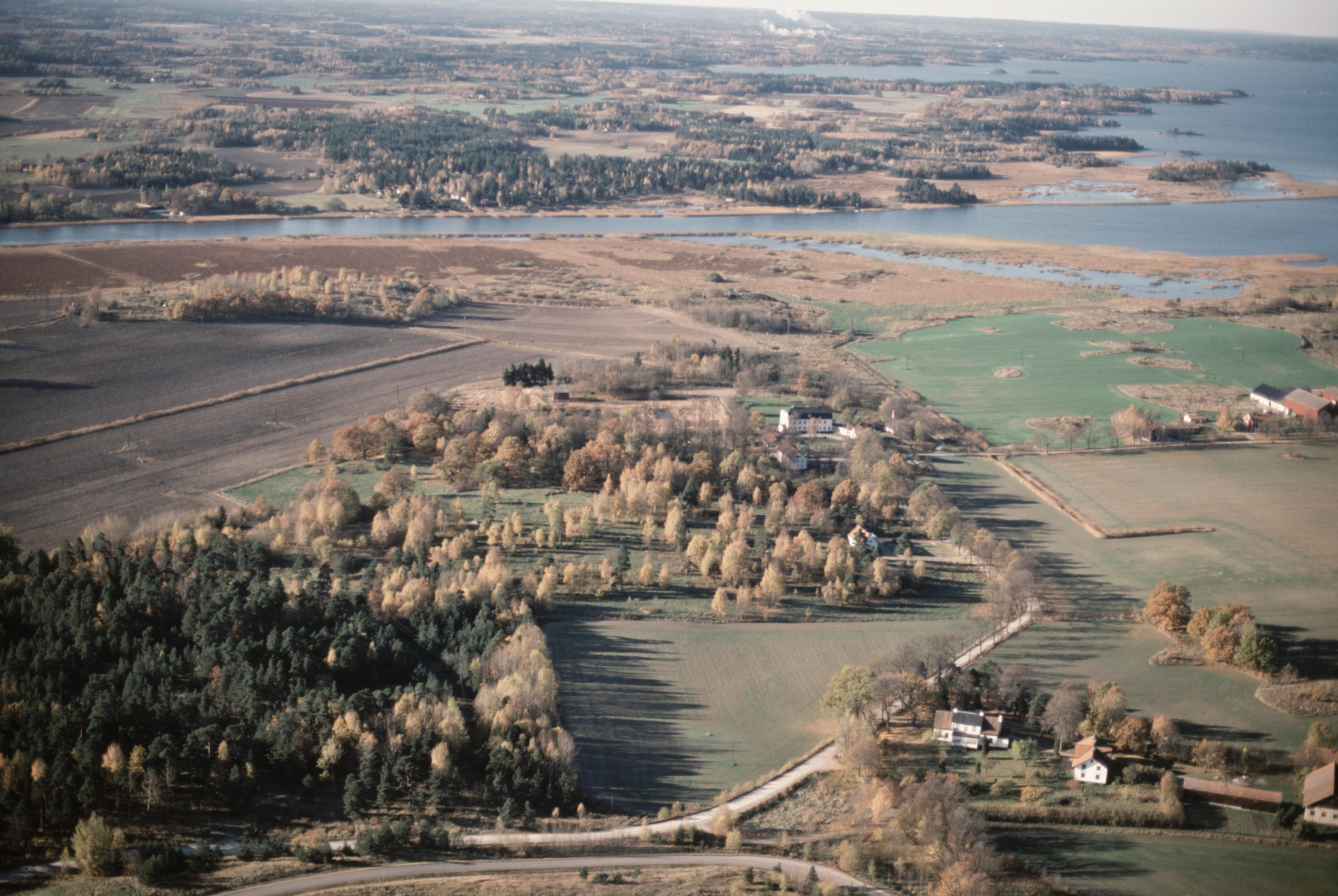 Beskrivning: (Tid. Östra Eneby socken). Hällristningar RAÄnr Östra Eneby 23:1, 29:1-3, 77:1-3, 156:1 m.fl. vid gården Ekenberg (nere till höger) och Leonardsbergs herrgård (vid bildens mitt). Motala ström i bildens övre del. Bilden är tagen mot (väderstreck): VSV