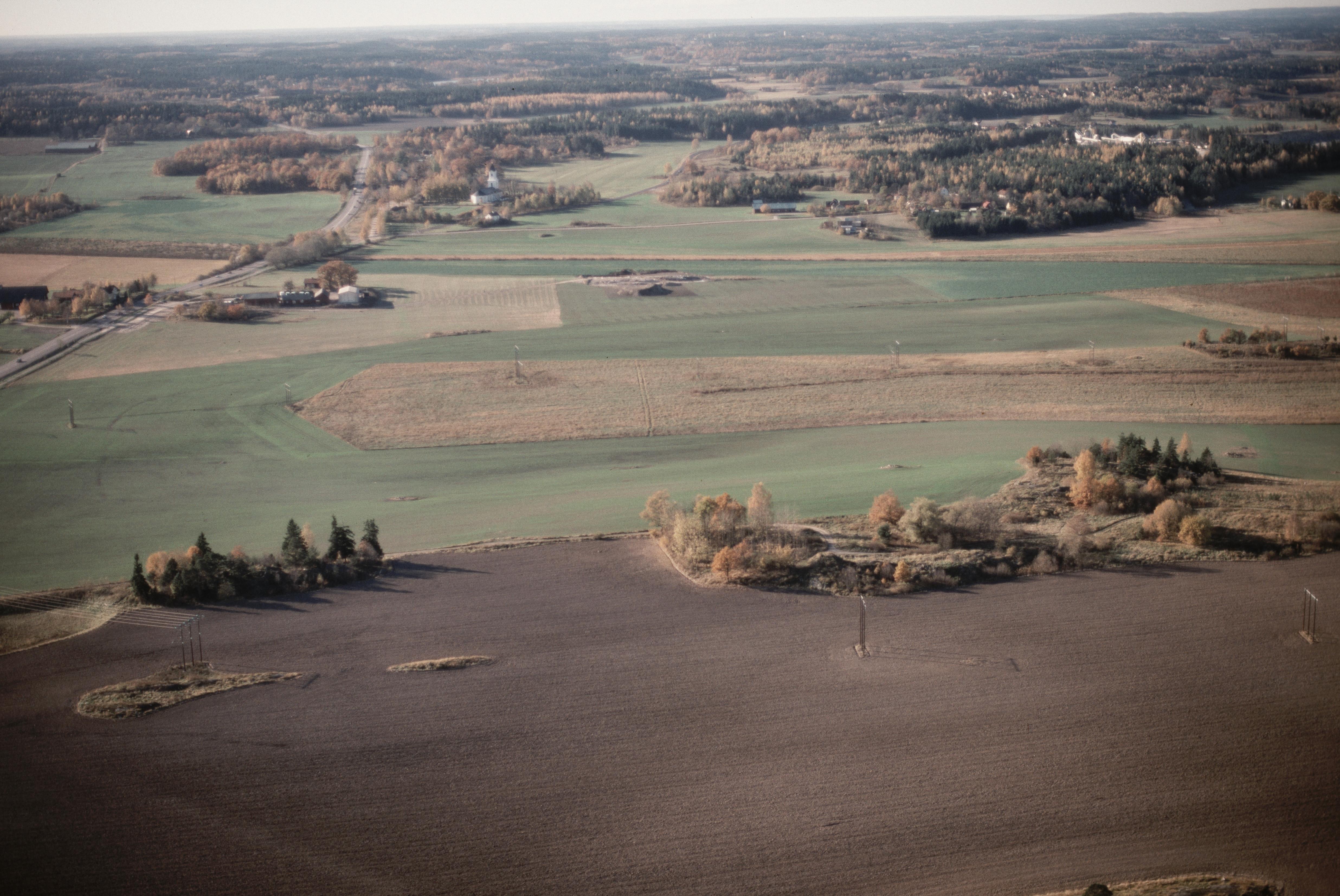 Beskrivning: Vid bildens mitt hällristningar RAÄnr Borg 50:1 och 51:1 (i tidigare i Borgs socken). Borgs kyrka till vänster i bildens övre del. Bilden är tagen mot (väderstreck): VSV