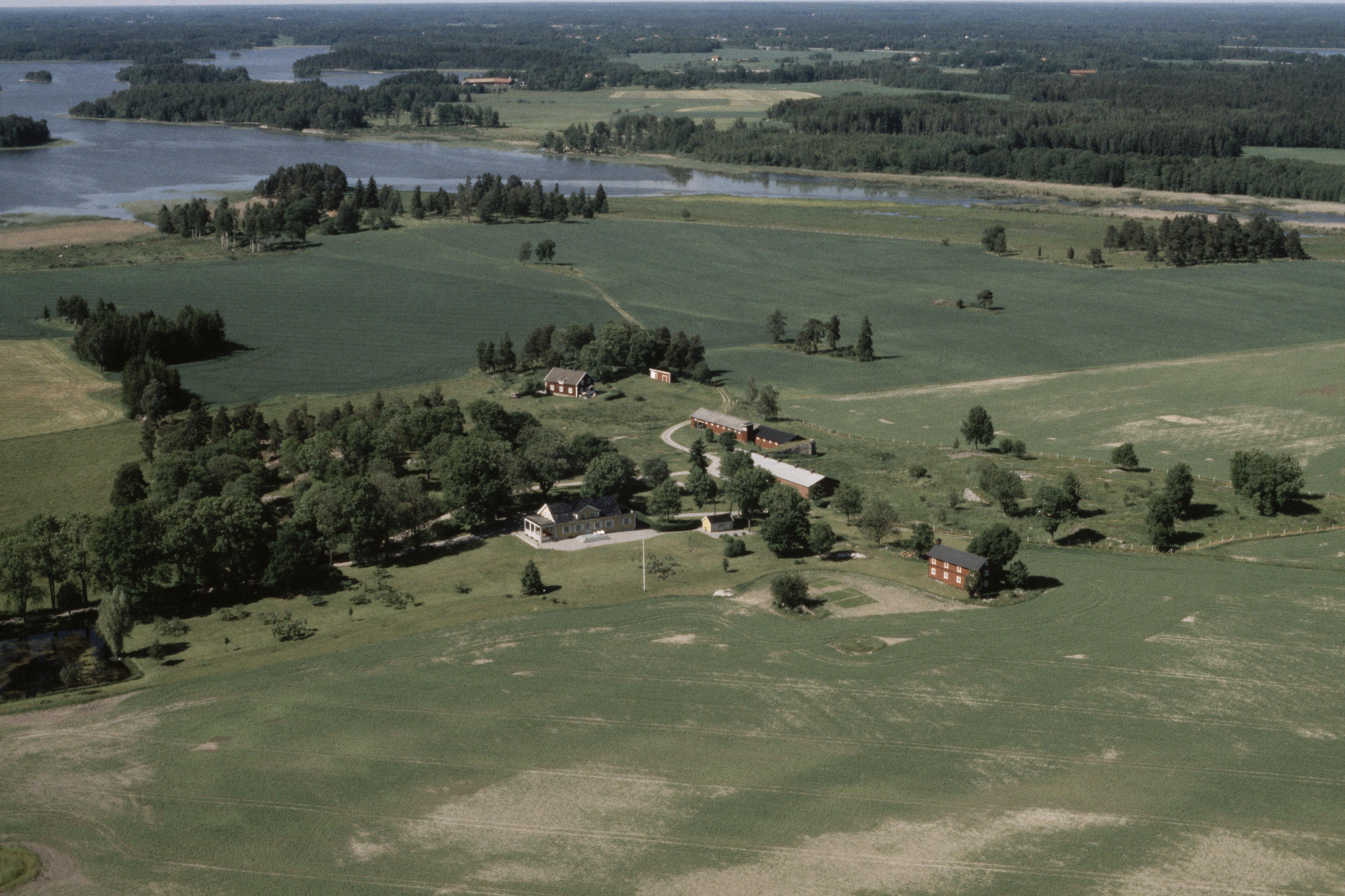 Beskrivning: Helgesta gård. Gravfält RAÄnr Stigtomta 136:1 till vänster. I bildens övre del Lidasundet och Hallbosjön. Bilden är tagen mot (väderstreck): N