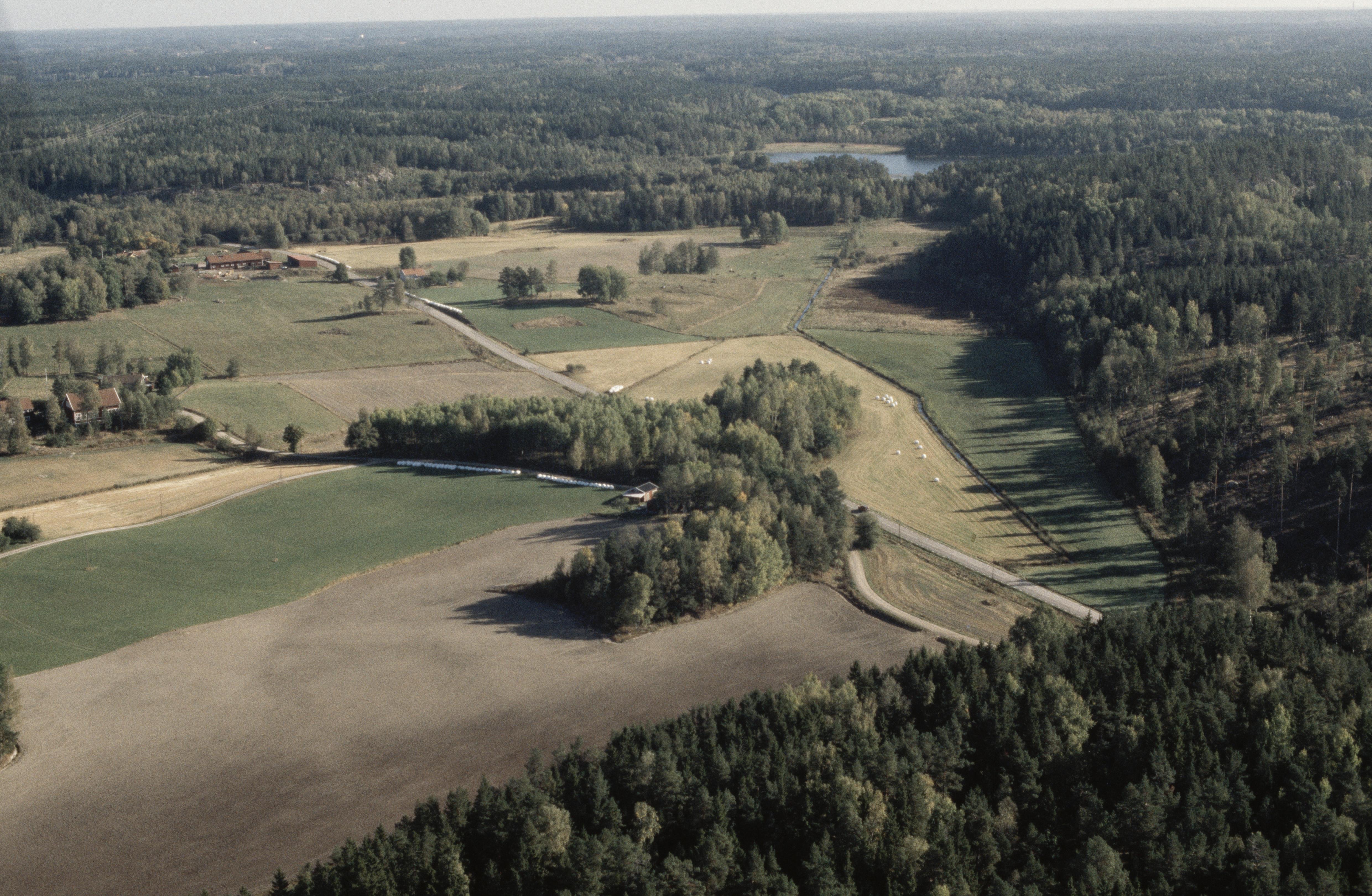 Beskrivning: Eriksgatan (på sträckan Önnersta - Penningby) vid Stene by. Uppe till vänster gravfält Björnlunda 151:1. I bildens nedre del området vid runristning på block RAÄnr Björnlunda 155:1. Bilden är tagen mot (väderstreck): Ö
