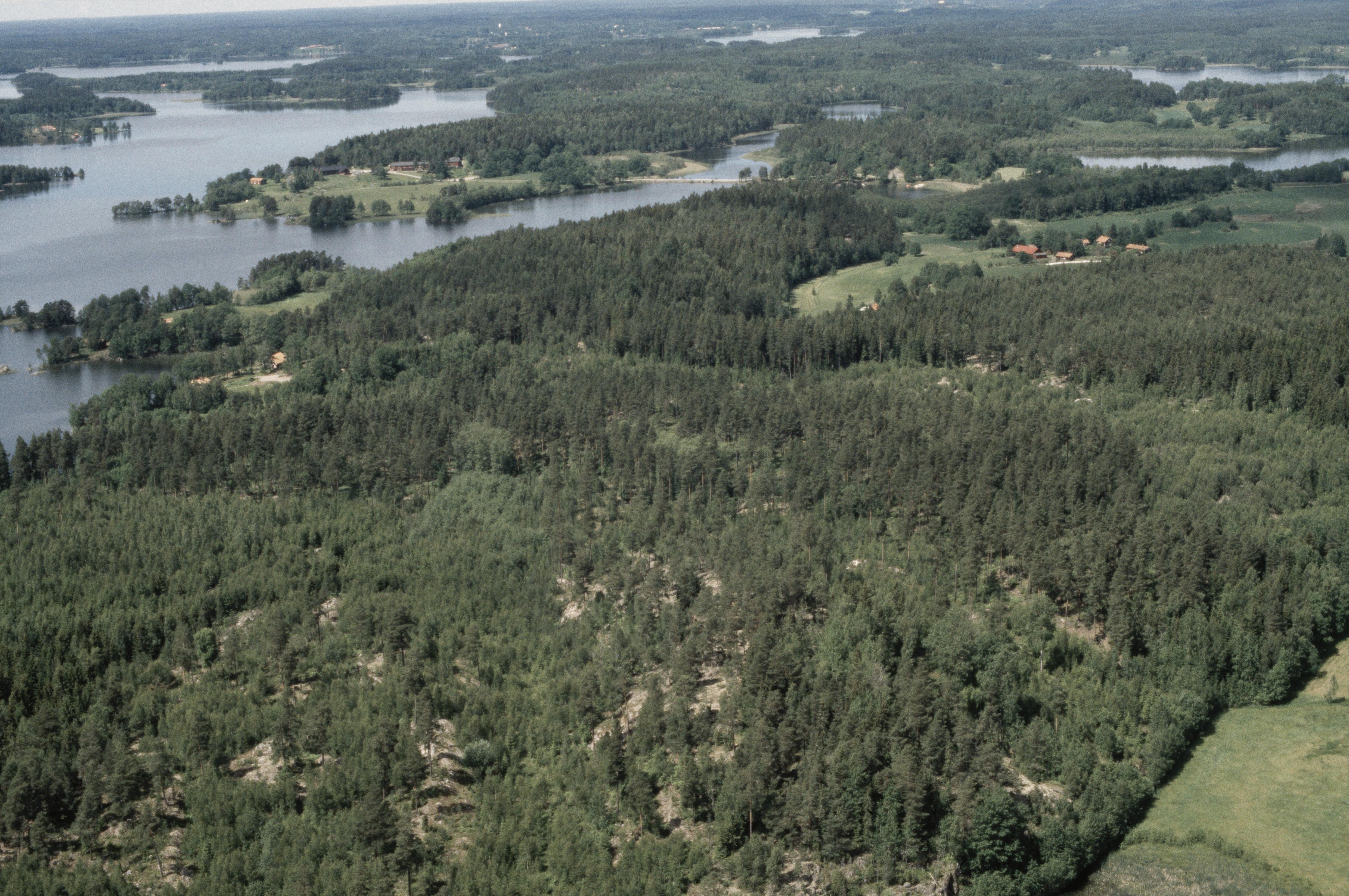 Beskrivning: Hyltingeö vid sjön Båven. Fornborg RAÄnr Hyltinge 62:1 vid bildens mitt. Överby Lillgård uppe till höger. I bildens övre del bron till Aspön och Aspö kursgård i Helgesta socken. Bilden är tagen mot (väderstreck): V
