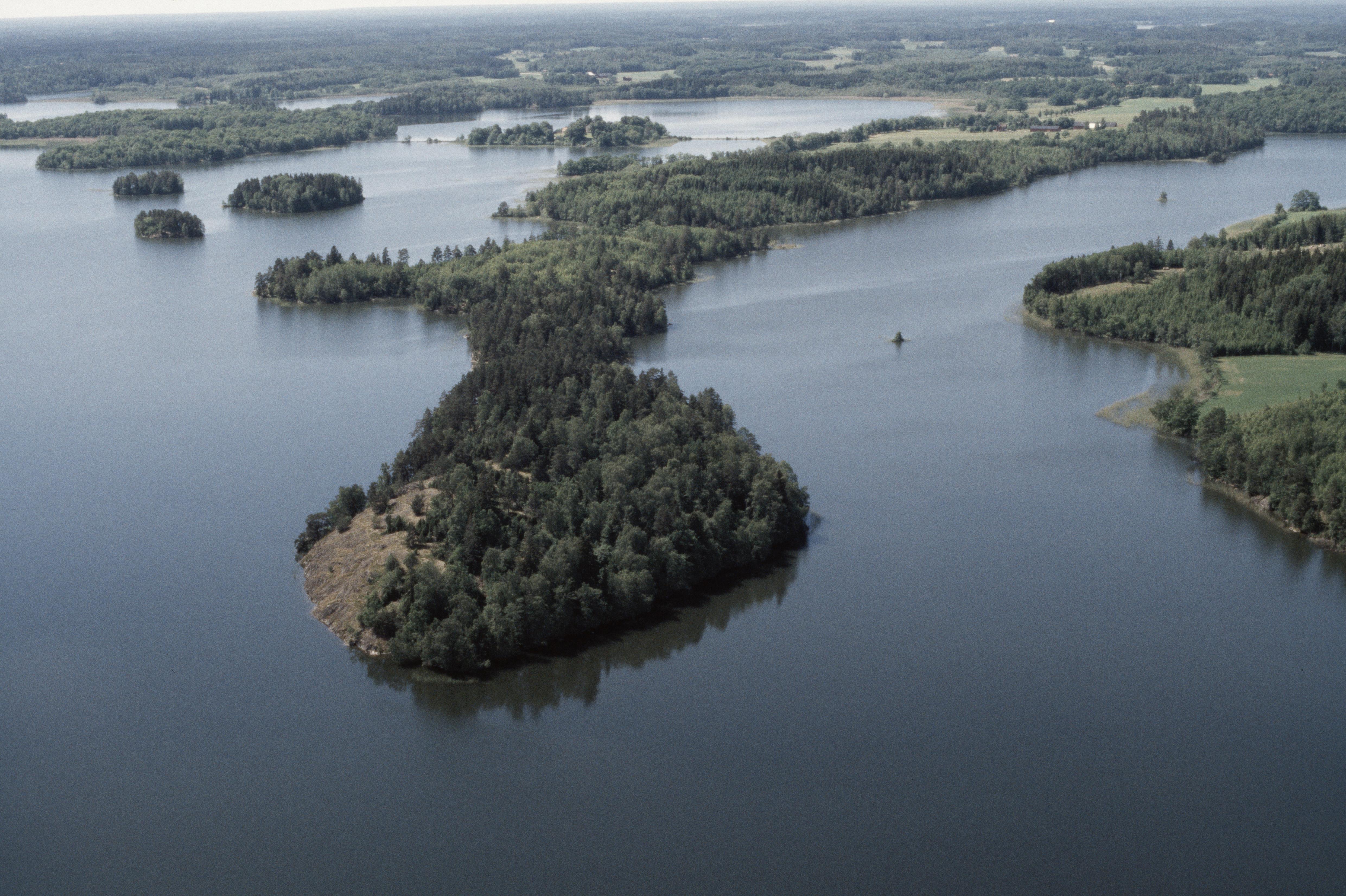 Beskrivning: Djurön i sjön Båven. Fornborg RAÄnr Årdala 124:1 "Fyrstens fornborg". I bildens övre del till vänster Vibyholms slott. Bilden är tagen mot (väderstreck): S