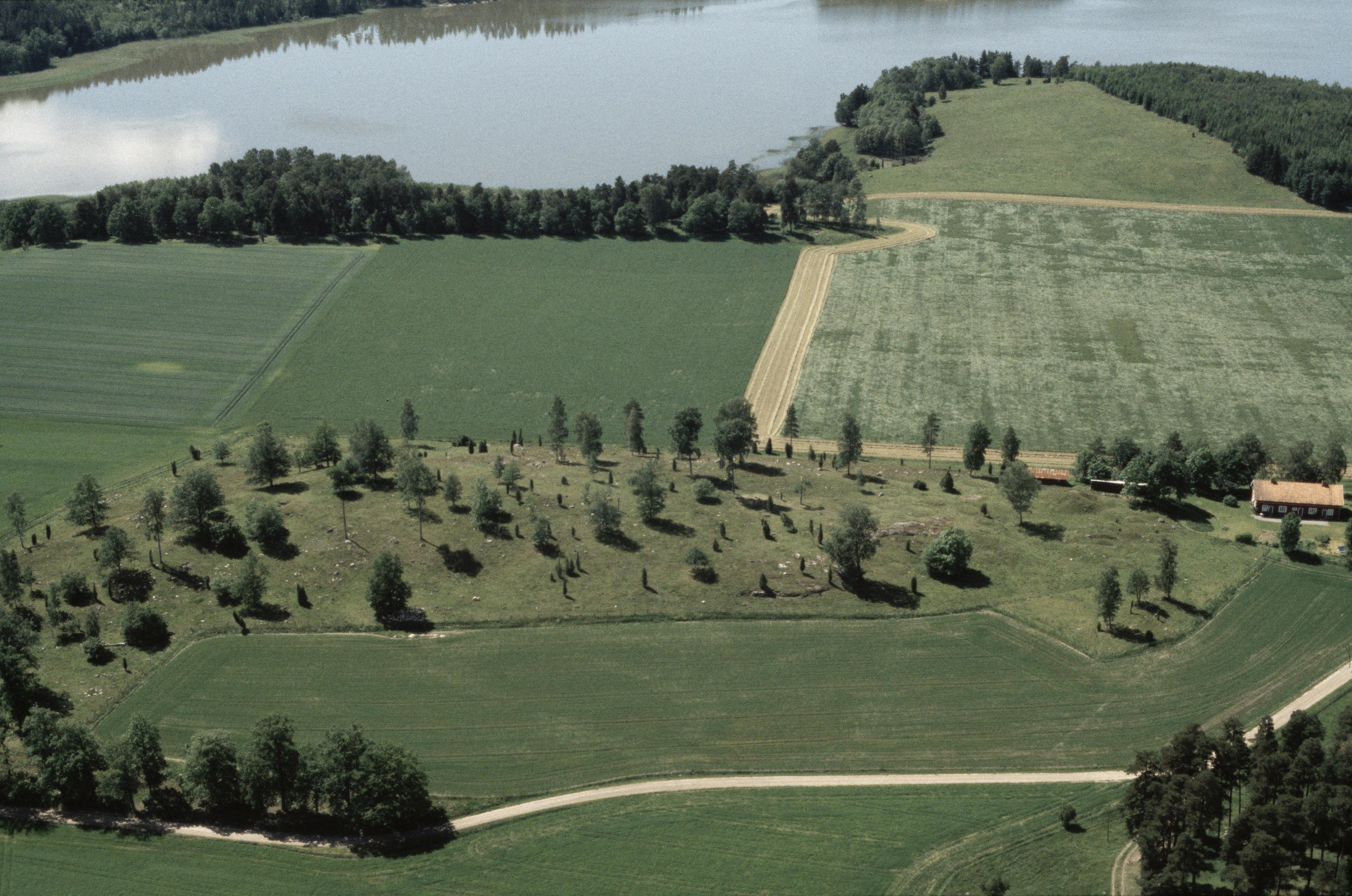 Beskrivning: Gravfält RAÄnr Spelvik 5:1. Landshammars gård vid sjön Eknaren. Bilden är tagen mot (väderstreck): SV