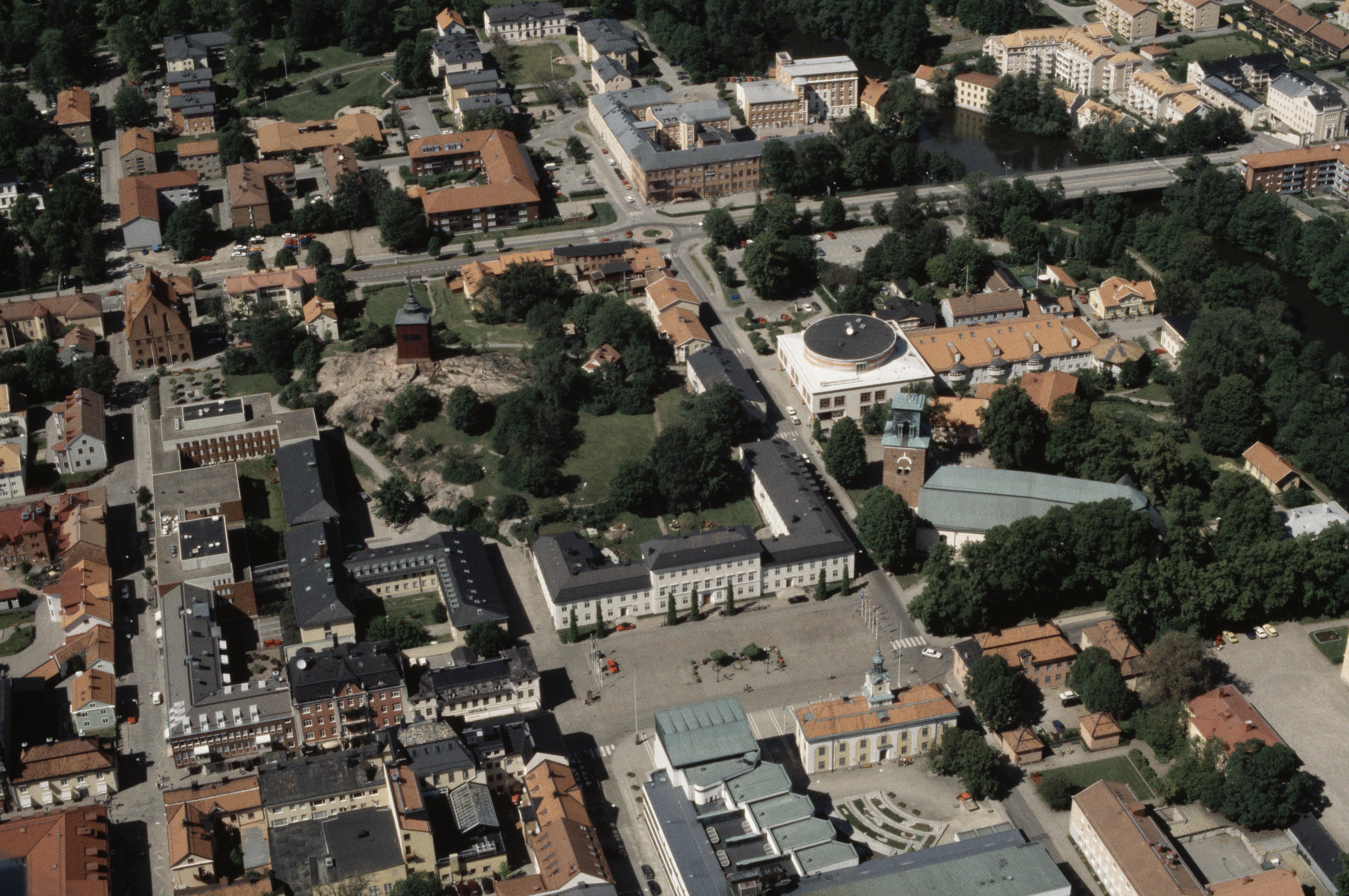 Beskrivning: Nyköpings stad, stadsdelen Väster. Stora Torget, Sankt Nicolai kyrka och Nyköpingsån. Bilden är tagen mot (väderstreck): N