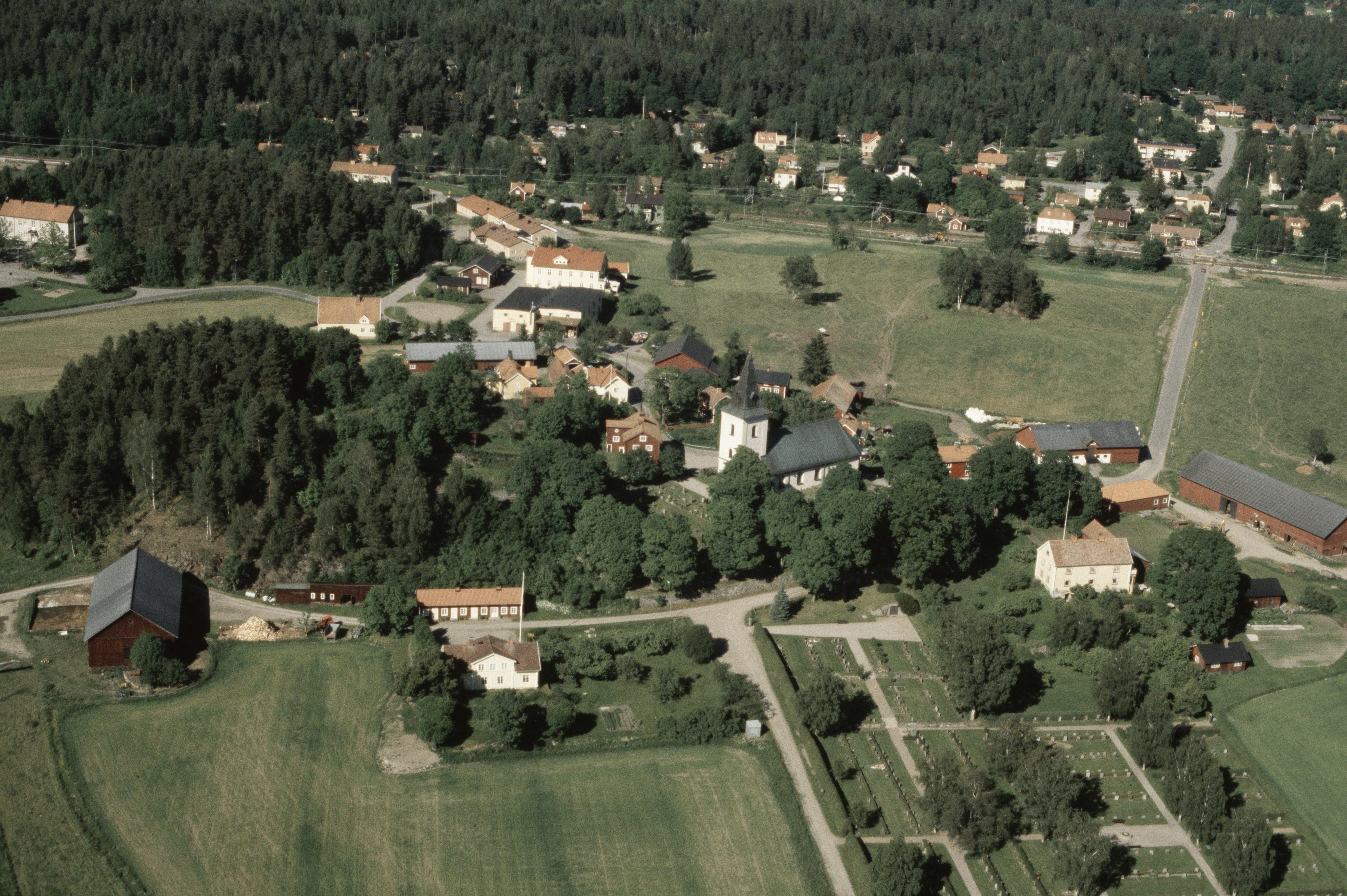 Beskrivning: Mellösa kyrka och kyrkby vid Mellösasjön. Bilden är tagen mot (väderstreck): NO