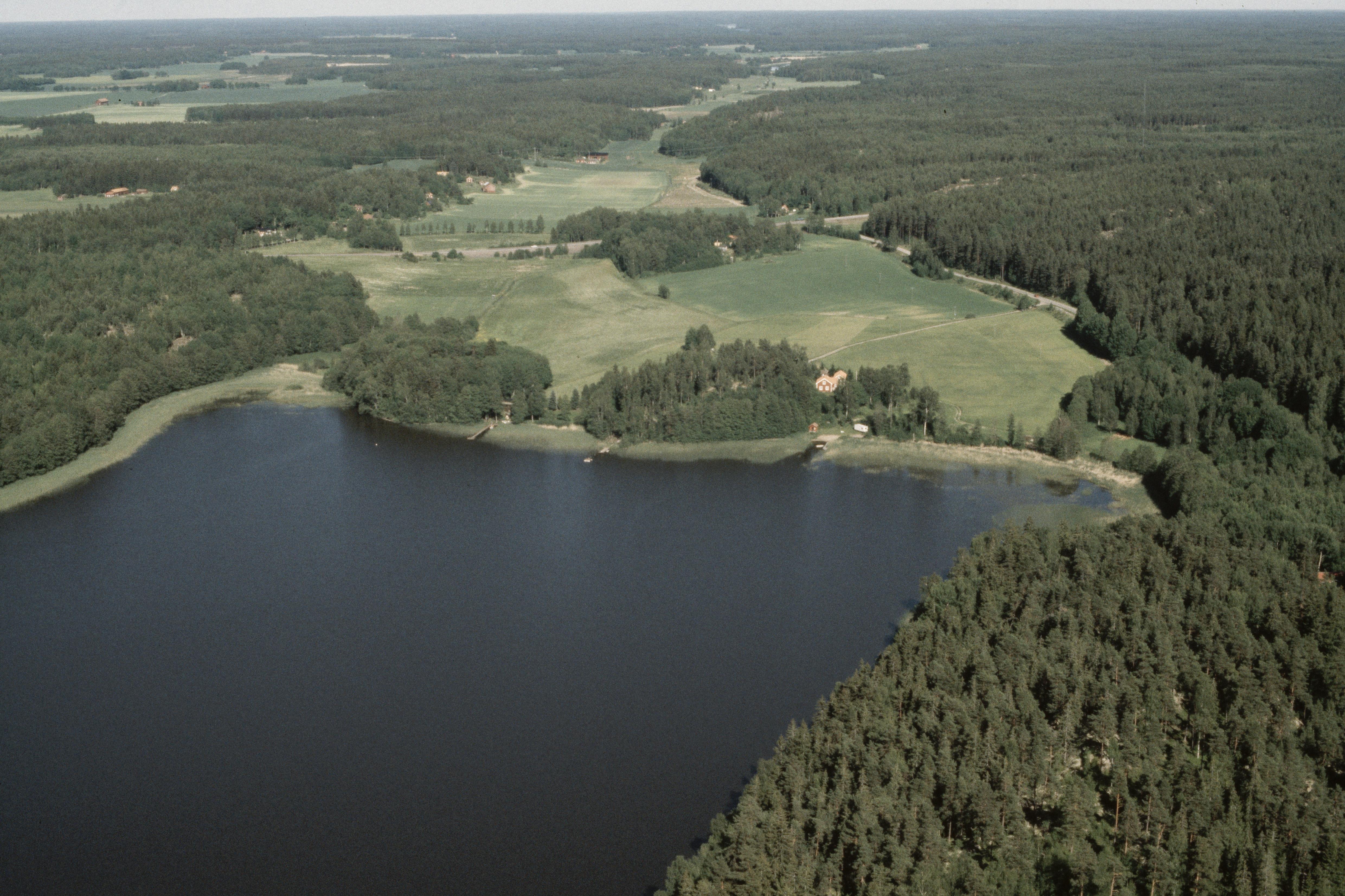 Beskrivning: Sjön Bårsten, Slytån och Risinge gård. I bildens övre del Slytådalen med fornborg Ogaklev RAÄnr Ärla 34:1. Uppe till vänster Slytan by. Bilden är tagen mot (väderstreck): Ö