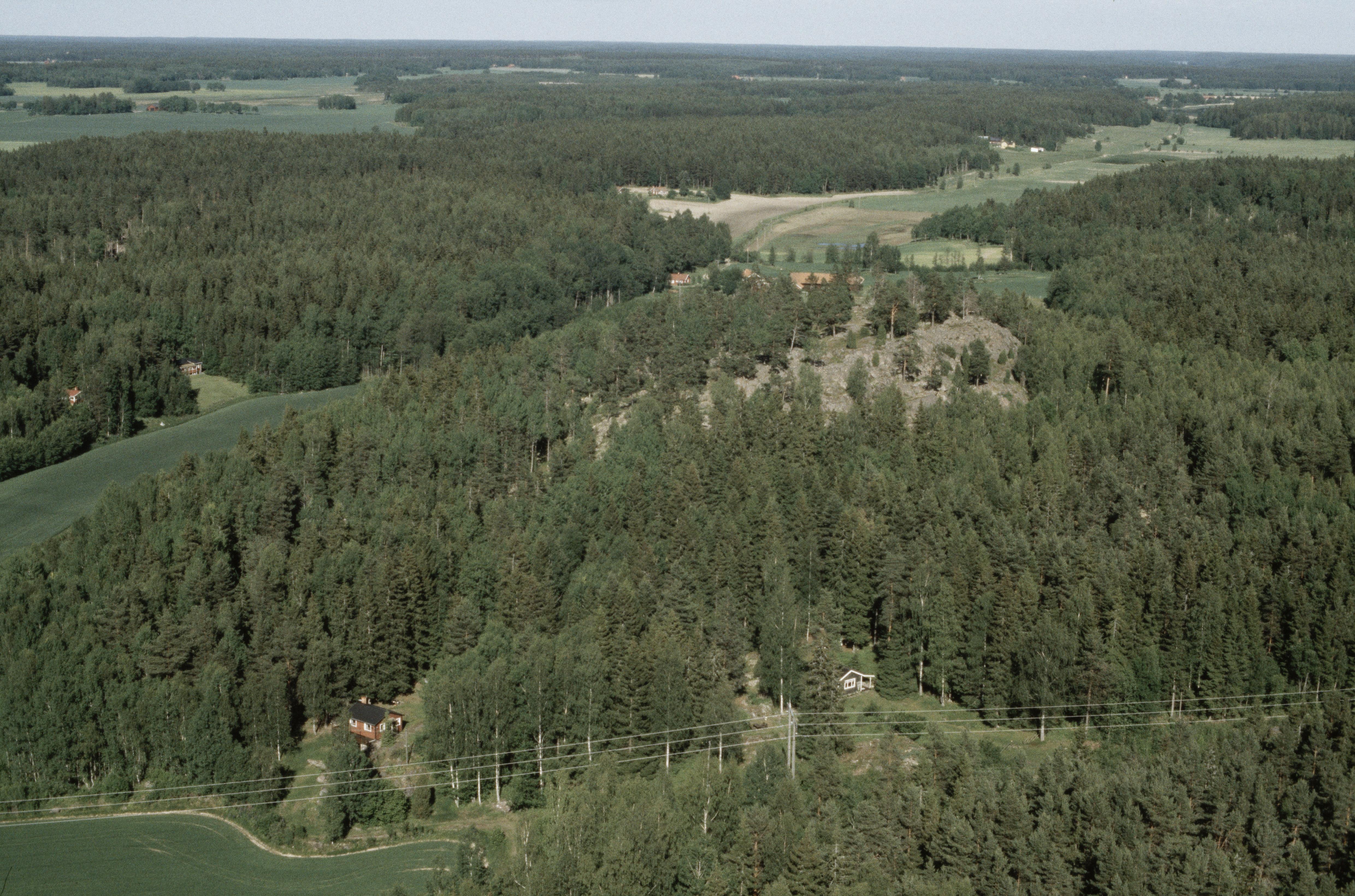 Beskrivning: Slytån vid gårdarna Slytan och Vabro i Slytådalen. Vid bildens mitt fornborg Ogaklev RAÄnr Ärla 34:1. Bilden är tagen mot (väderstreck): Ö
