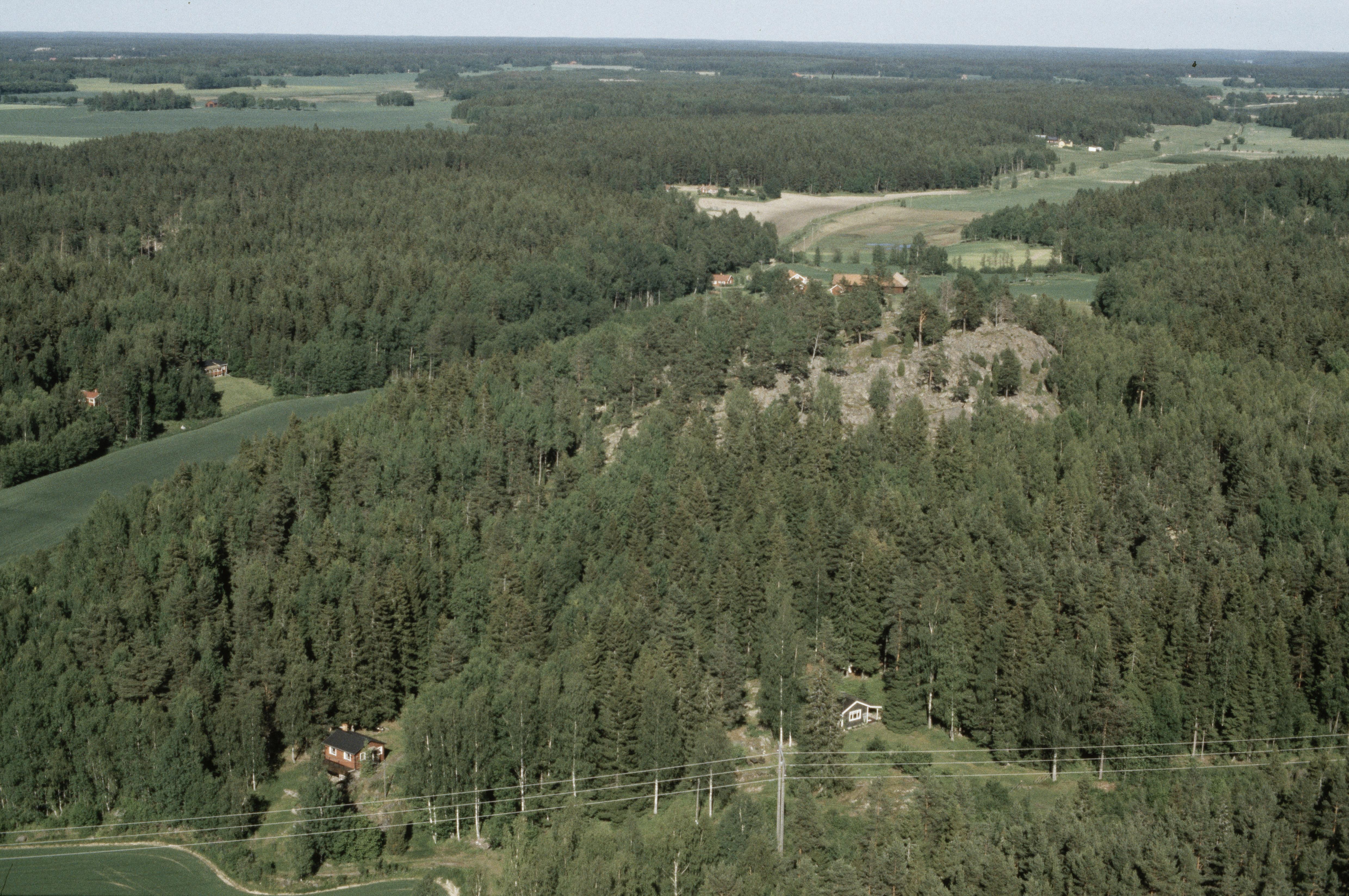Beskrivning: Slytån vid gårdarna Slytan och Vabro i Slytådalen. Vid bildens mitt fornborg Ogaklev RAÄnr Ärla 34:1. Bilden är tagen mot (väderstreck): Ö