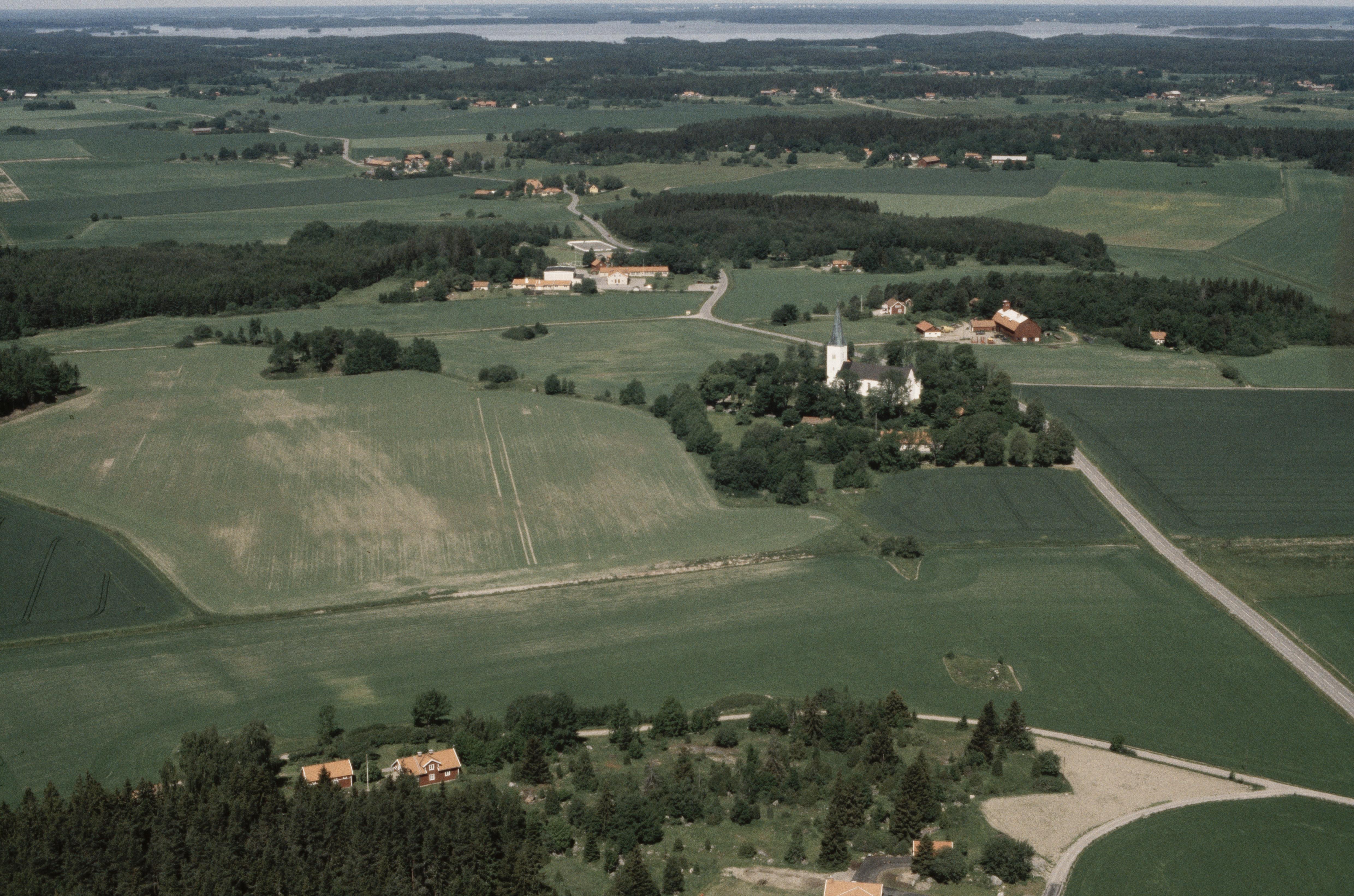 Beskrivning: Fogdö kyrka. I bildens nedre del gravfält RAÄnr Fogdö 4:1. Bilden är tagen mot (väderstreck): NNV