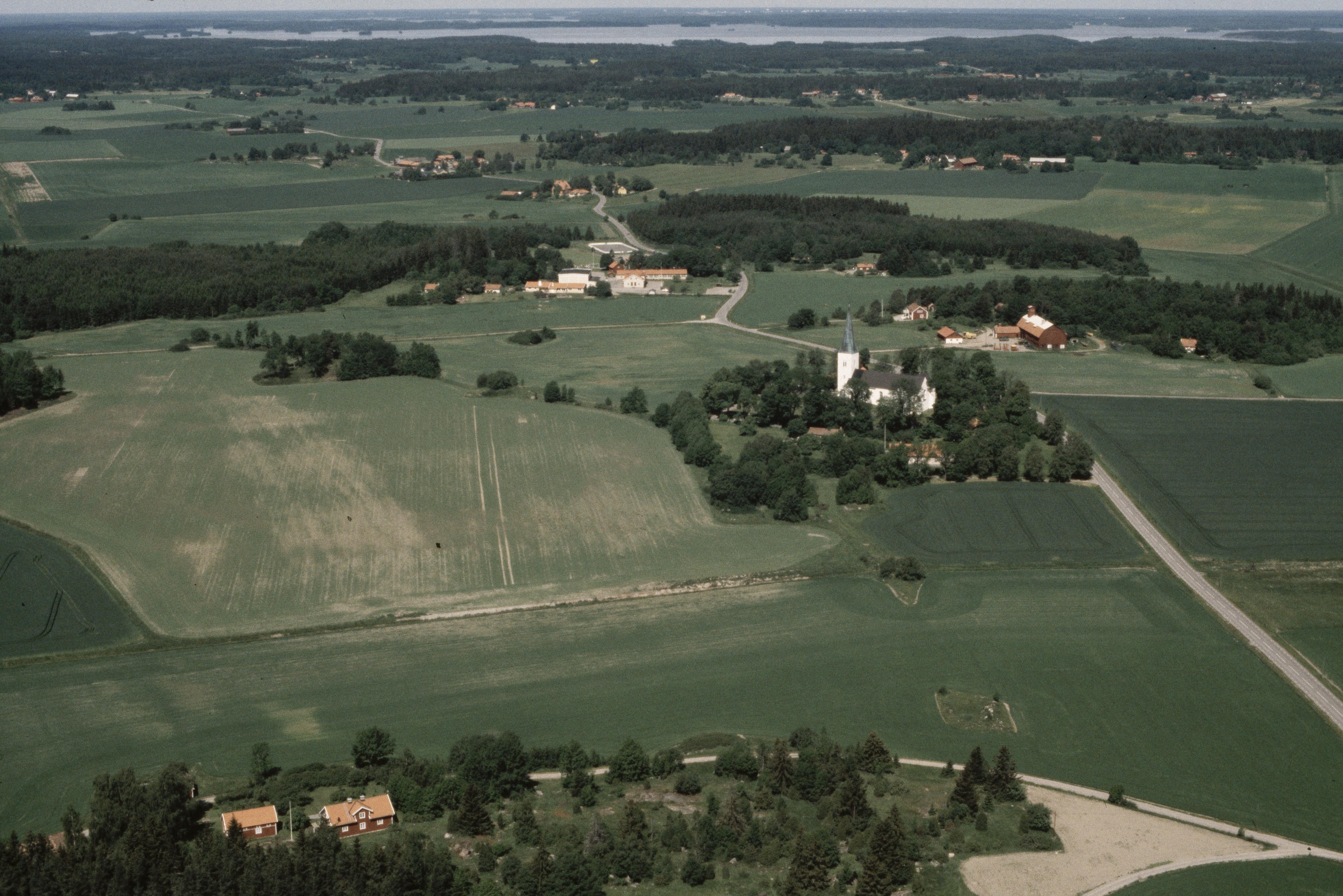 Beskrivning: Fogdö kyrka. I bildens nedre del gravfält RAÄnr Fogdö 4:1. Bilden är tagen mot (väderstreck): NNV