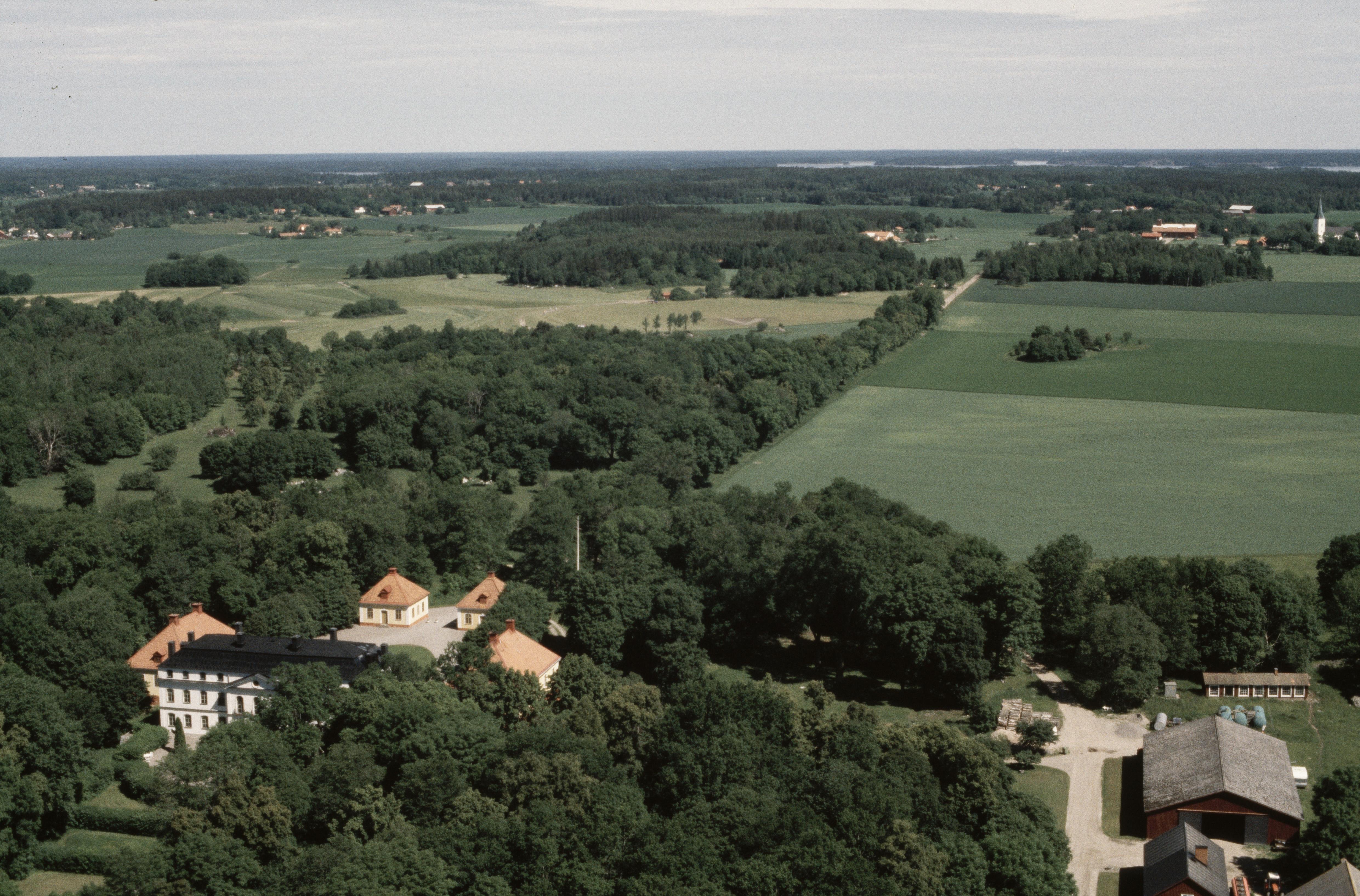 Beskrivning: Bergshammars herrgård RAÄnr Fogdö 109:1. Fogdö kyrka uppe till höger. Bilden är tagen mot (väderstreck): NNO
