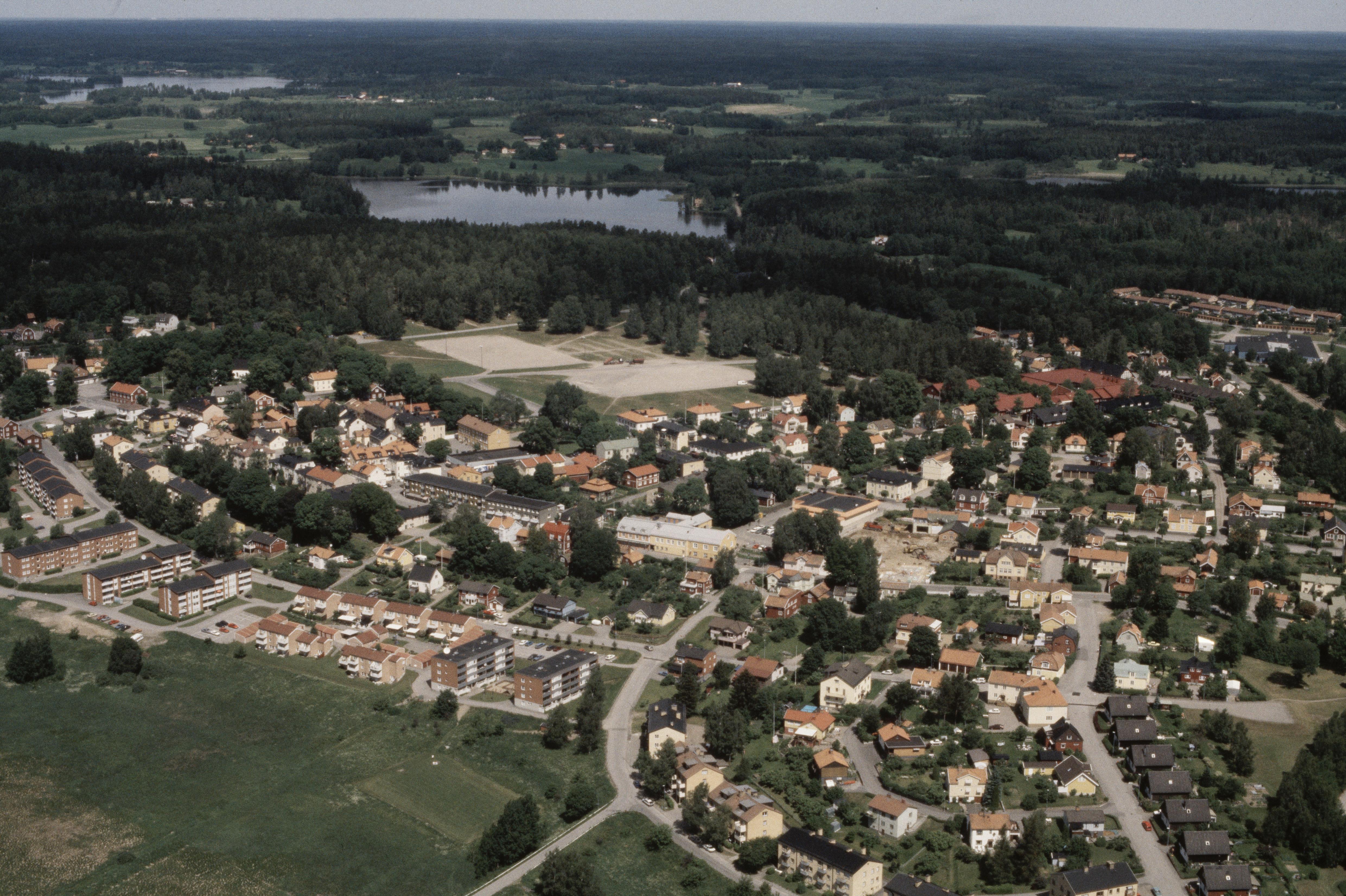 Beskrivning: Malmköpings tätort. Vid bildens mitt boplats RAÄnr Lilla Malma 49:1. I bildens övre del Hosjön och Östersjön. Bilden är tagen mot (väderstreck): N