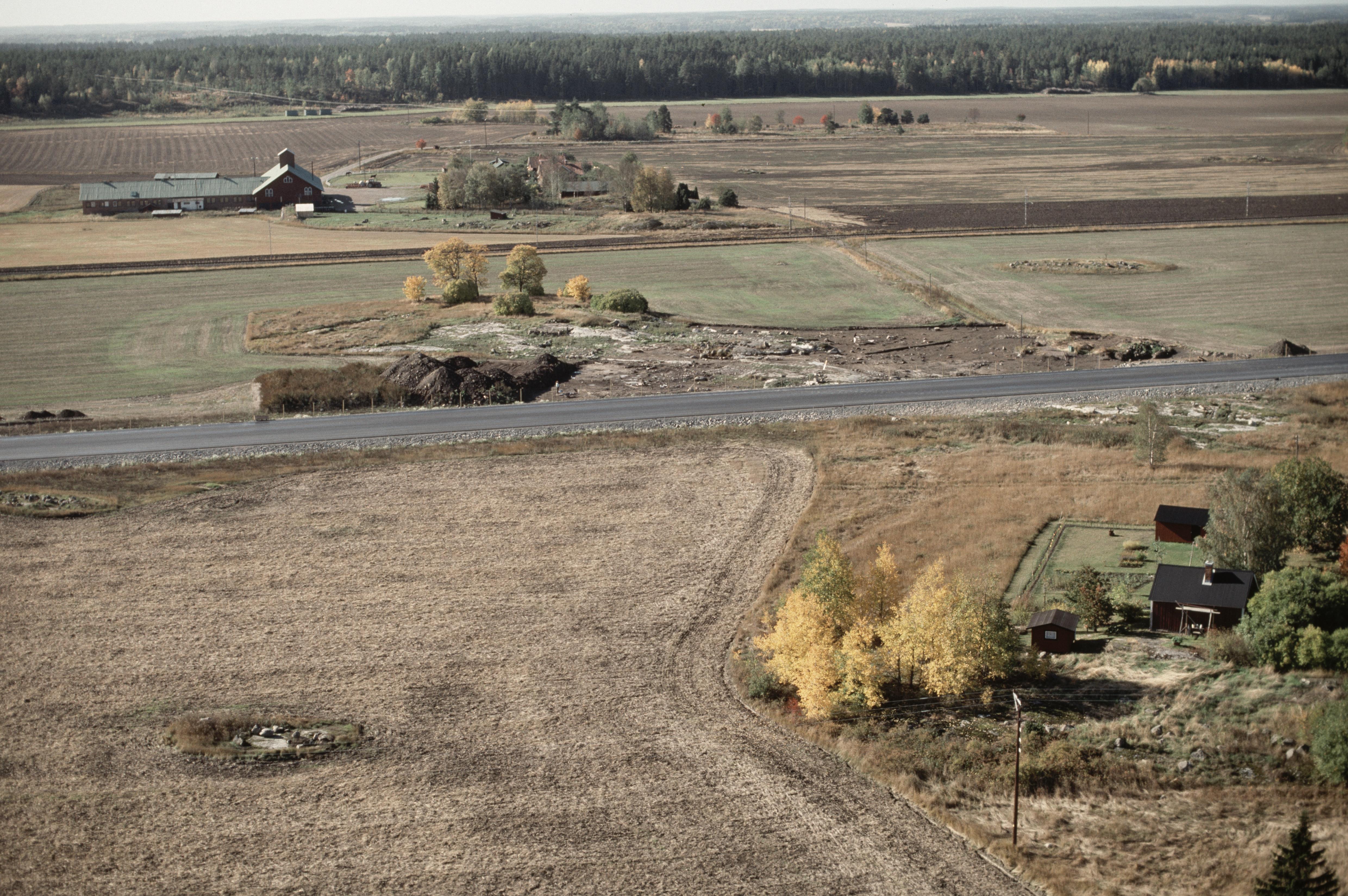 Beskrivning: Arkeologiska undersökningar innan bygge av väg E18 vid Apalle, Högsta och Pollista. Vid bildens mitt Pollista gamla tomt RAÄnr Övergran 228:1 vid gravfält Dragonbacken. Bilden är tagen mot (väderstreck): S