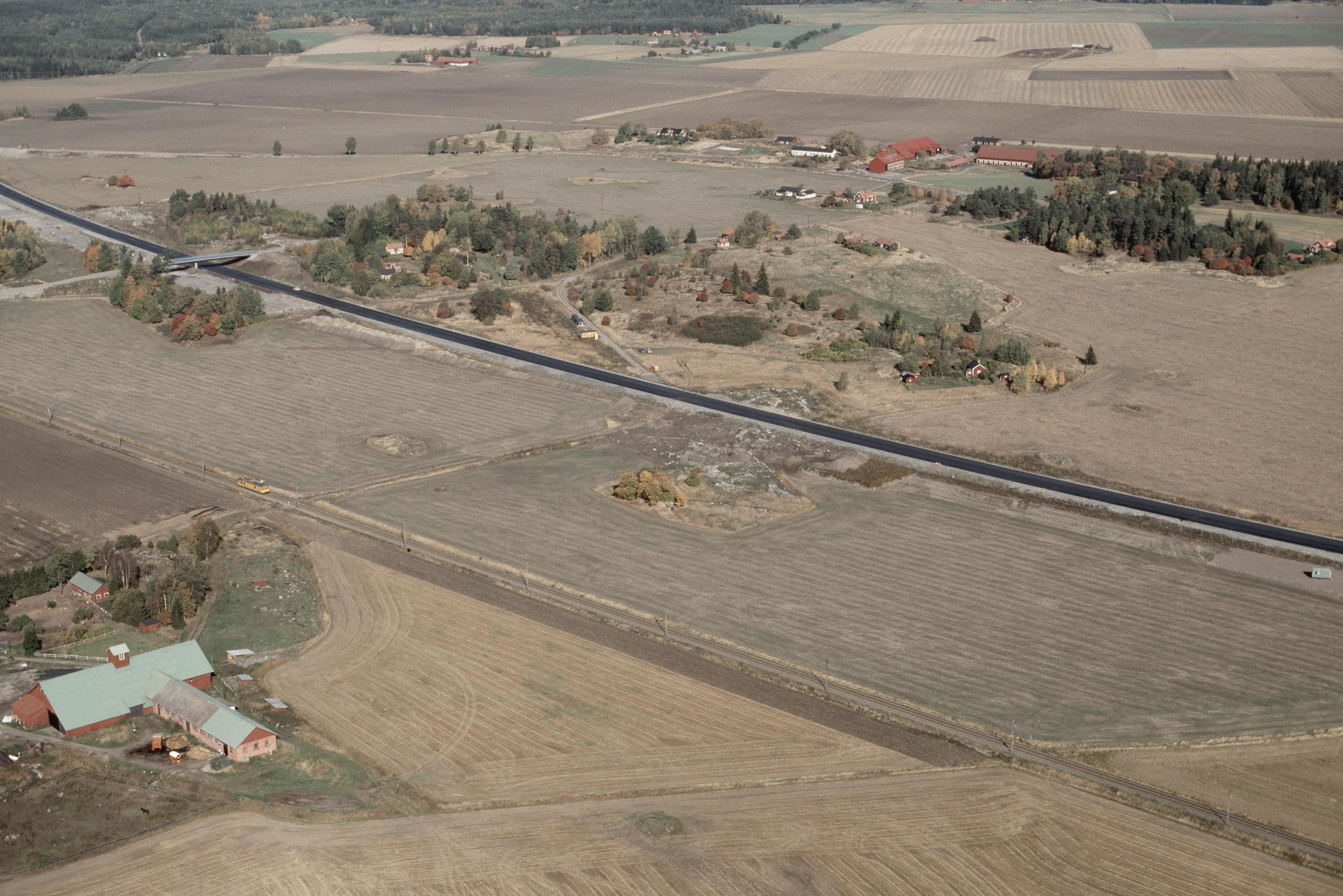 Beskrivning: Arkeologiska undersökningar innan bygge av väg E18 vid Apalle, Högsta och Pollista. Vid bildens mitt gravfält Dragonbacken RAÄnr Övergran 9:1 och Pollista gamla tomt RAÄnr Övergran 228:1. Bilden är tagen mot (väderstreck): NV