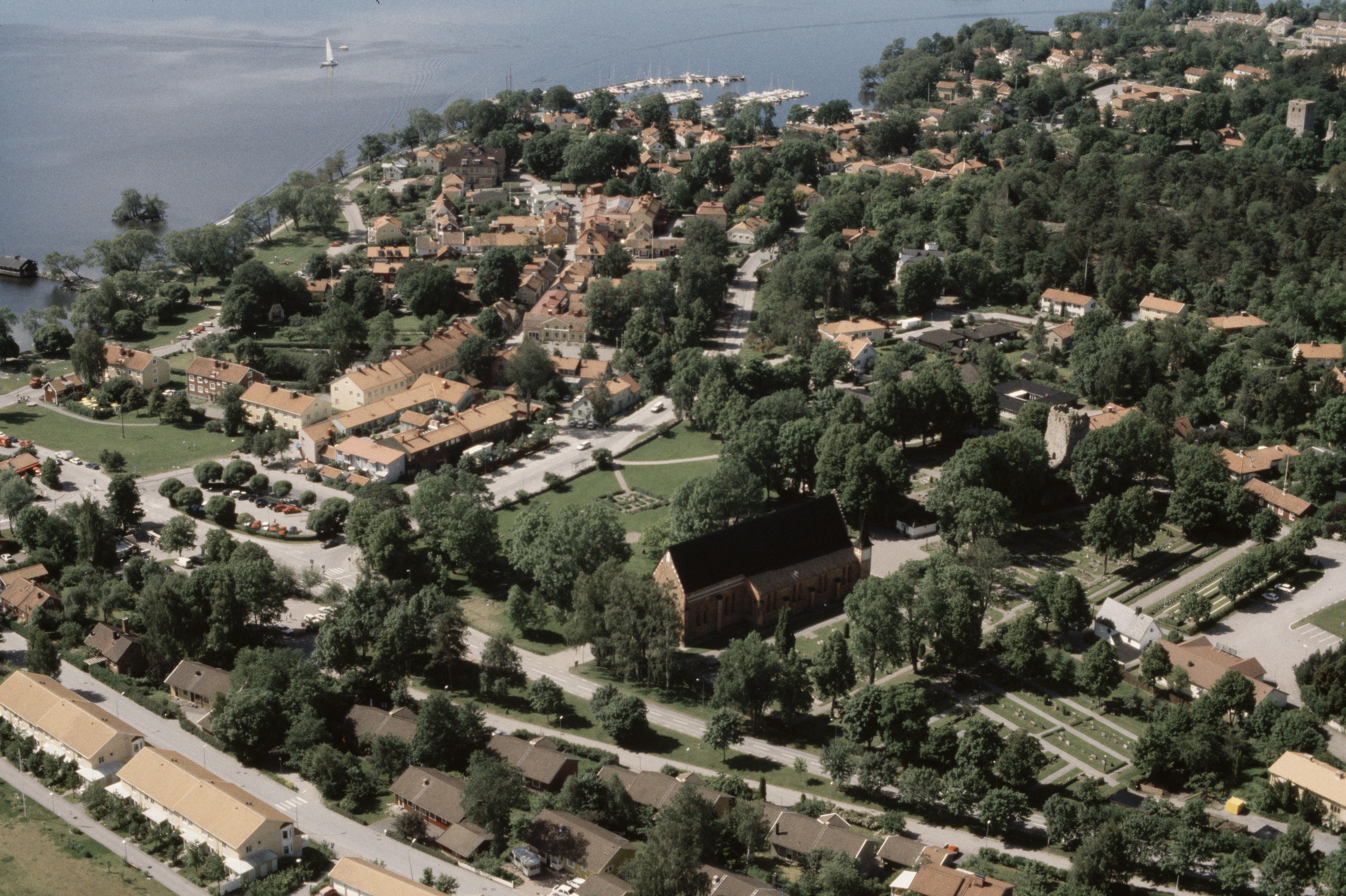 Beskrivning: Sigtuna stad vid Sigtunafjärden i Mälaren. Stadslager RAÄnr Sigtuna 195:1 m.fl. Under bildens mitt Mariakyrkan och Sankt Olofs kyrkoruin RAÄnr Sigtuna 22:1. Uppe till höger Sankt Pers kyrkoruin RAÄnr Sigtuna 28:1. Bilden är tagen mot (väderstreck): SV