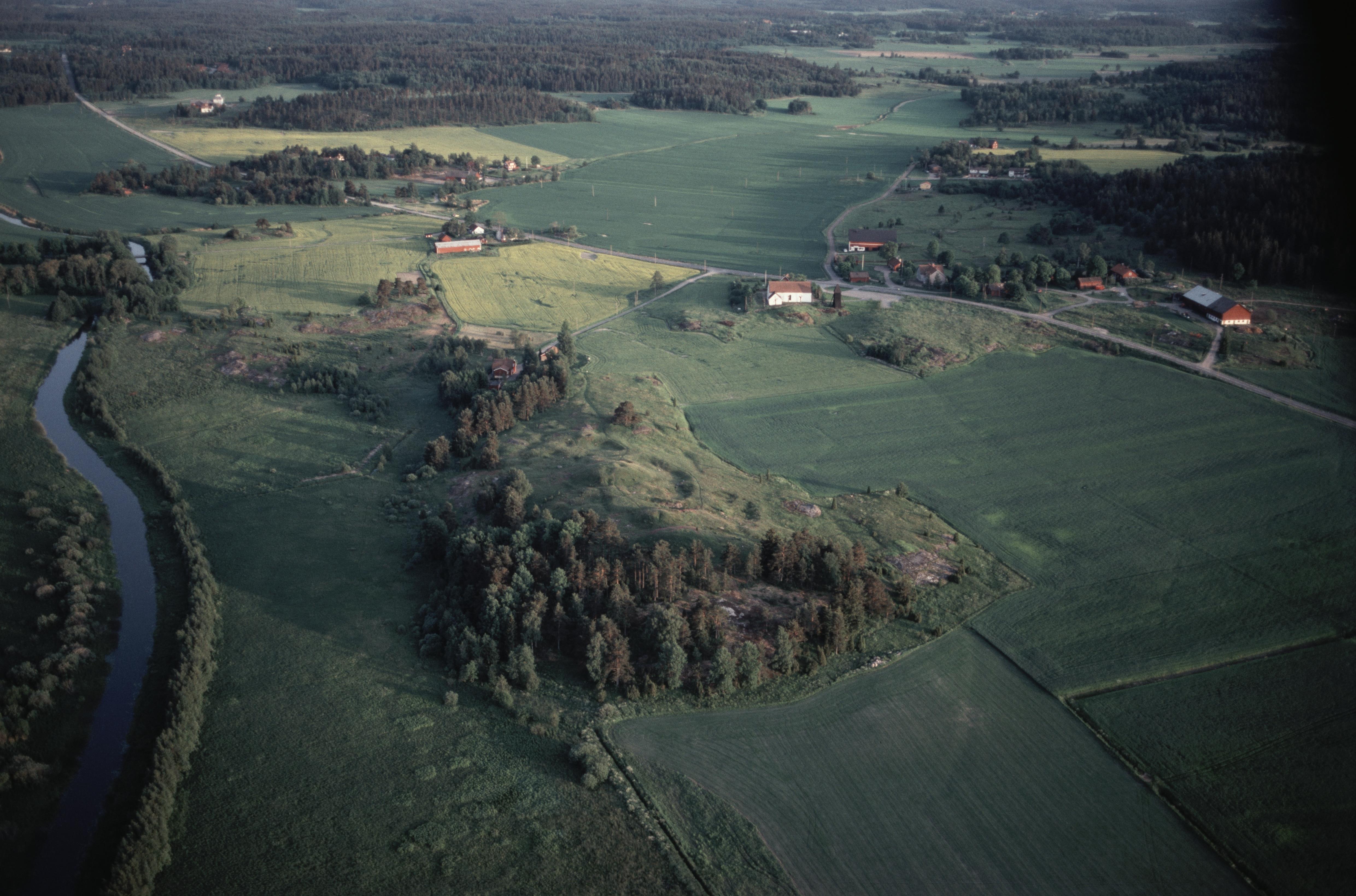 Beskrivning: Helgöåns dalgång i Långhundraleden. Ån markerar gränsen mot socknet Össeby-Garn (i bildens vänstra kant). Vid bildens mitt gravfältet Sjökullarna RAÄnr Vada 10:1. I bildens övre del Vada kyrka. Bilden är tagen mot (väderstreck): S