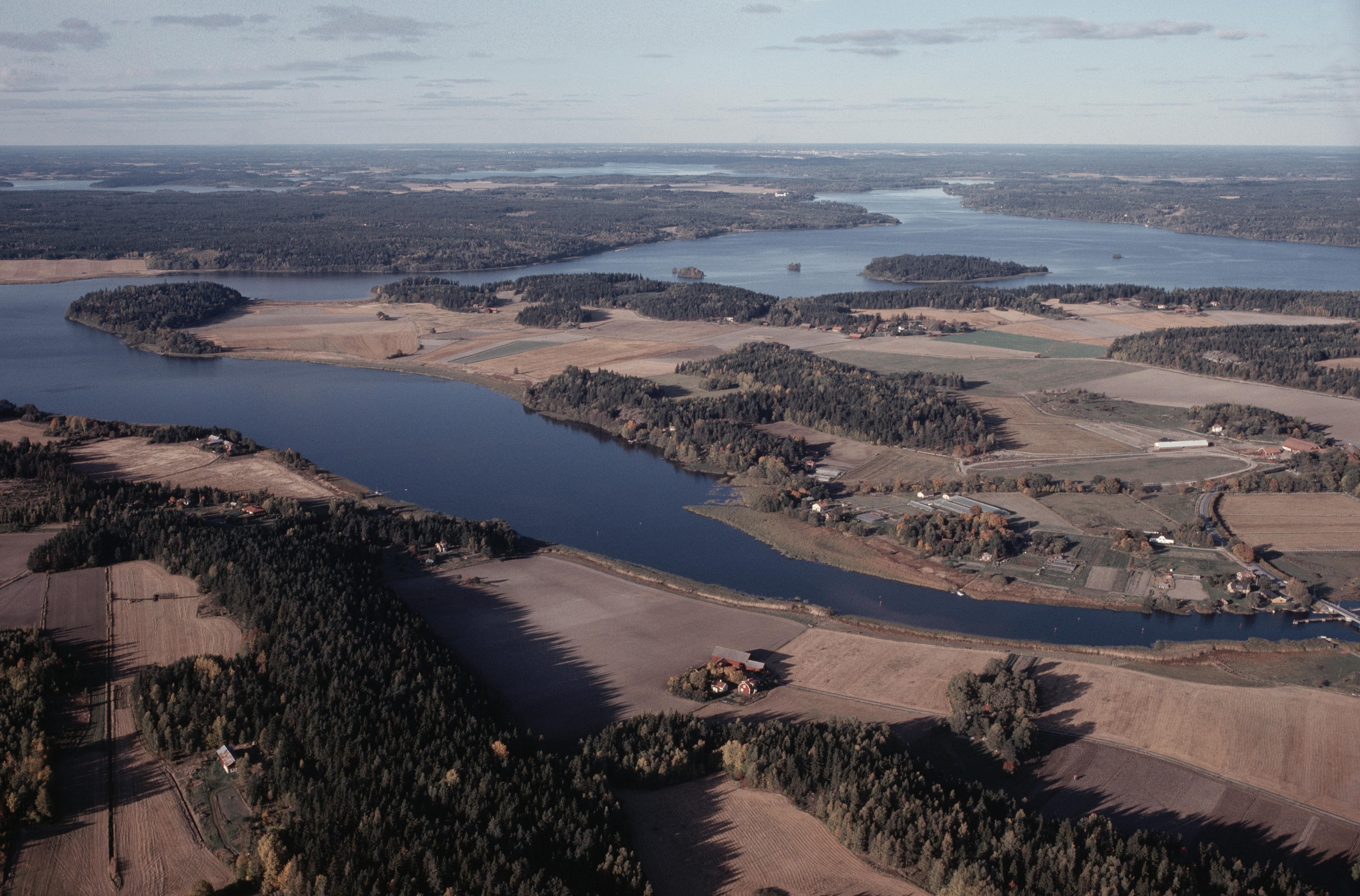 Beskrivning: Under bildens mitt byarna Sjöhagen (till vänster) och Berga mot Erikssund i Håtunaviken, norr om Sigtunafjärden i Mälaren. Stensättning RAÄnr Håtuna 3:1 vid Berga under bildens mitt. I bildens övre del socknen Häggeby och Sankt Per mot Skofjärden. Bilden är tagen mot (väderstreck): N