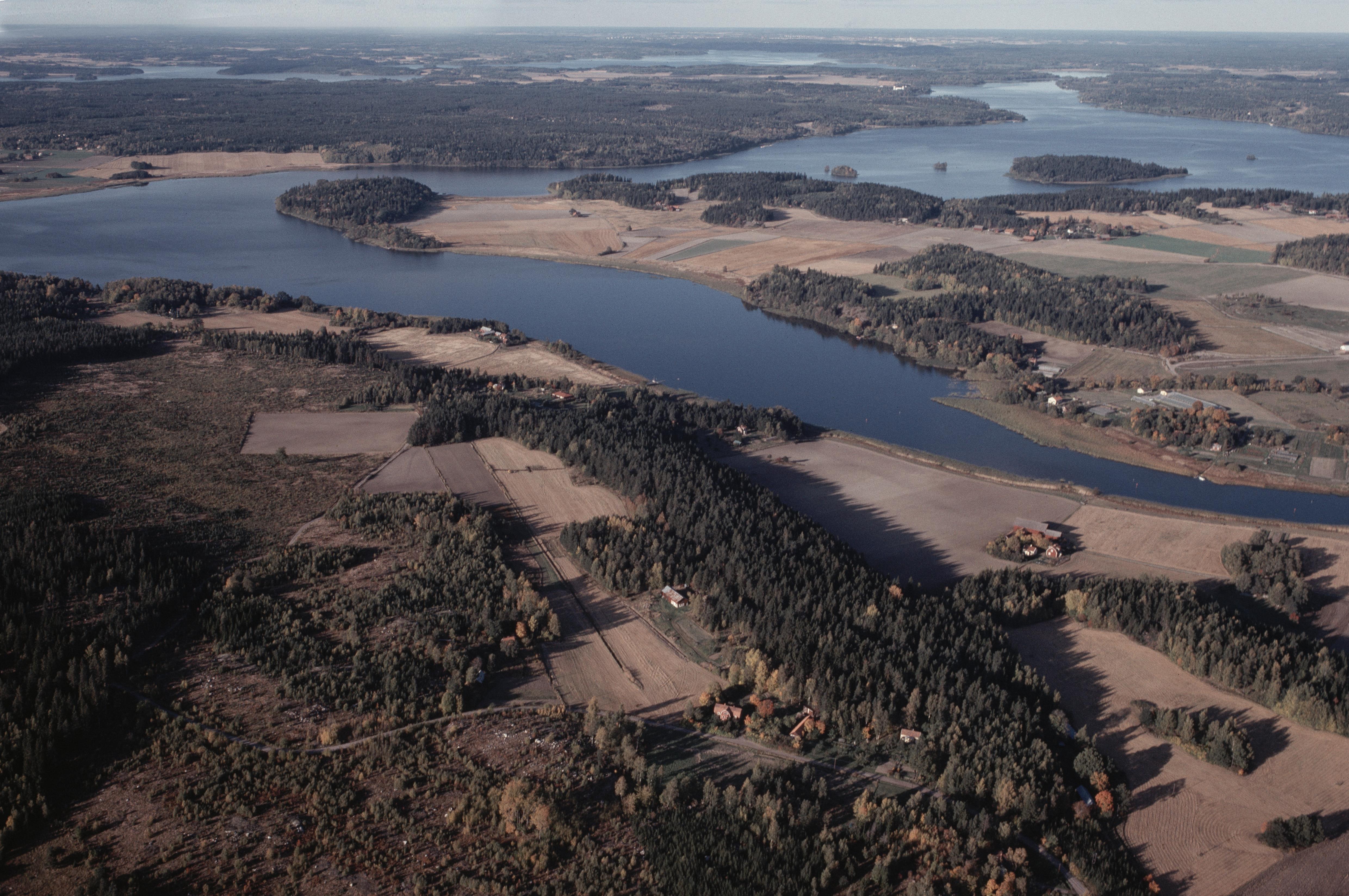 Beskrivning: Under bildens mitt byarna Sjöhagen (till vänster) och Berga mot Erikssund i Håtunaviken, norr om Sigtunafjärden i Mälaren. Stensättning RAÄnr Håtuna 3:1 vid Berga under bildens mitt. I bildens övre del socknen Häggeby och Sankt Per mot Skofjärden. Bilden är tagen mot (väderstreck): N