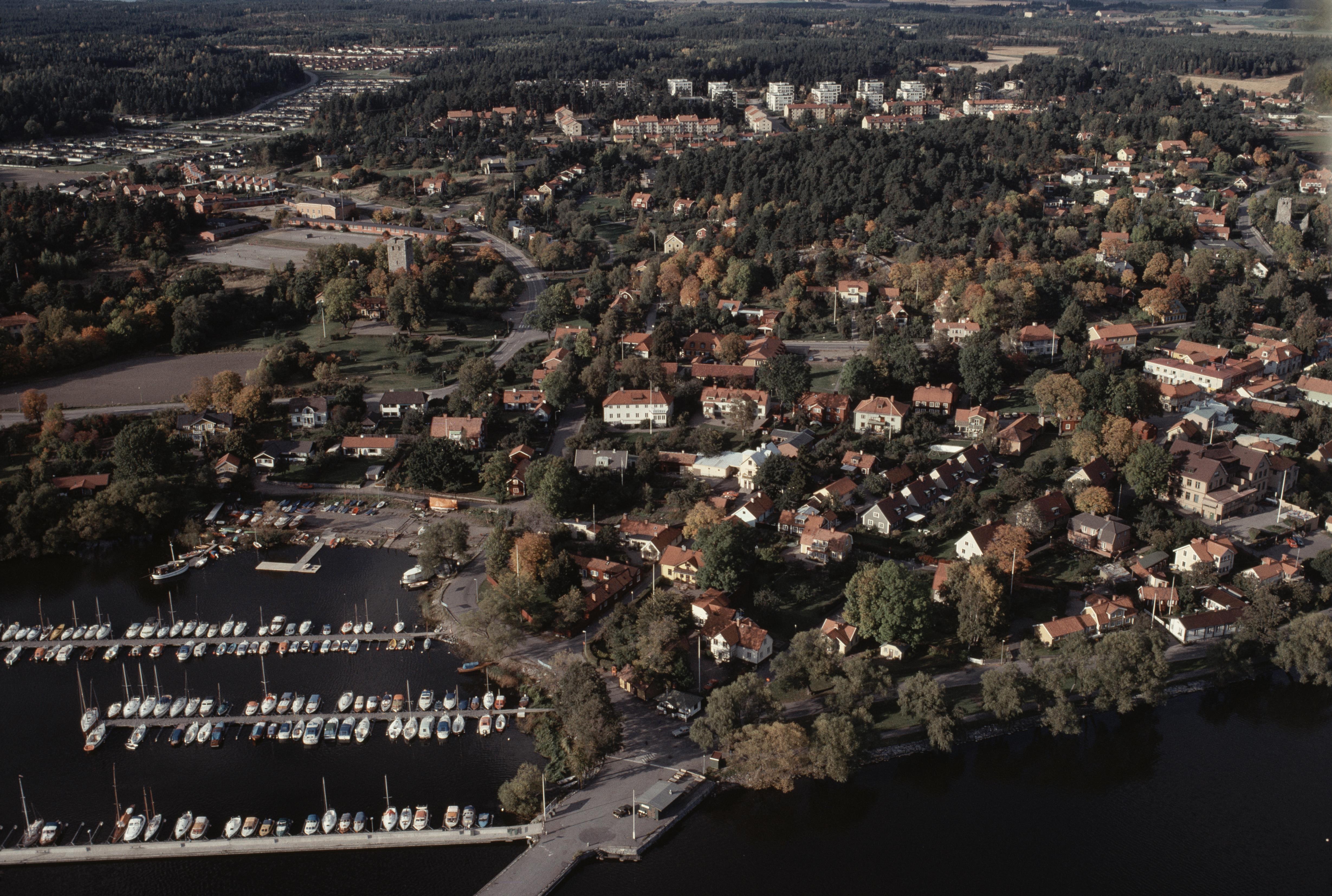 Beskrivning: Sigtuna stad vid Sigtunafjärden i Mälaren. Stadslager RAÄnr Sigtuna 195:1 m.fl. Till vänster om bildens mitt Sankt Pers kyrkoruin RAÄnr Sigtuna 28:1 och till höger Sankt Olofs kyrkoruin RAÄnr Sigtuna 22:1. Bilden är tagen mot (väderstreck): N