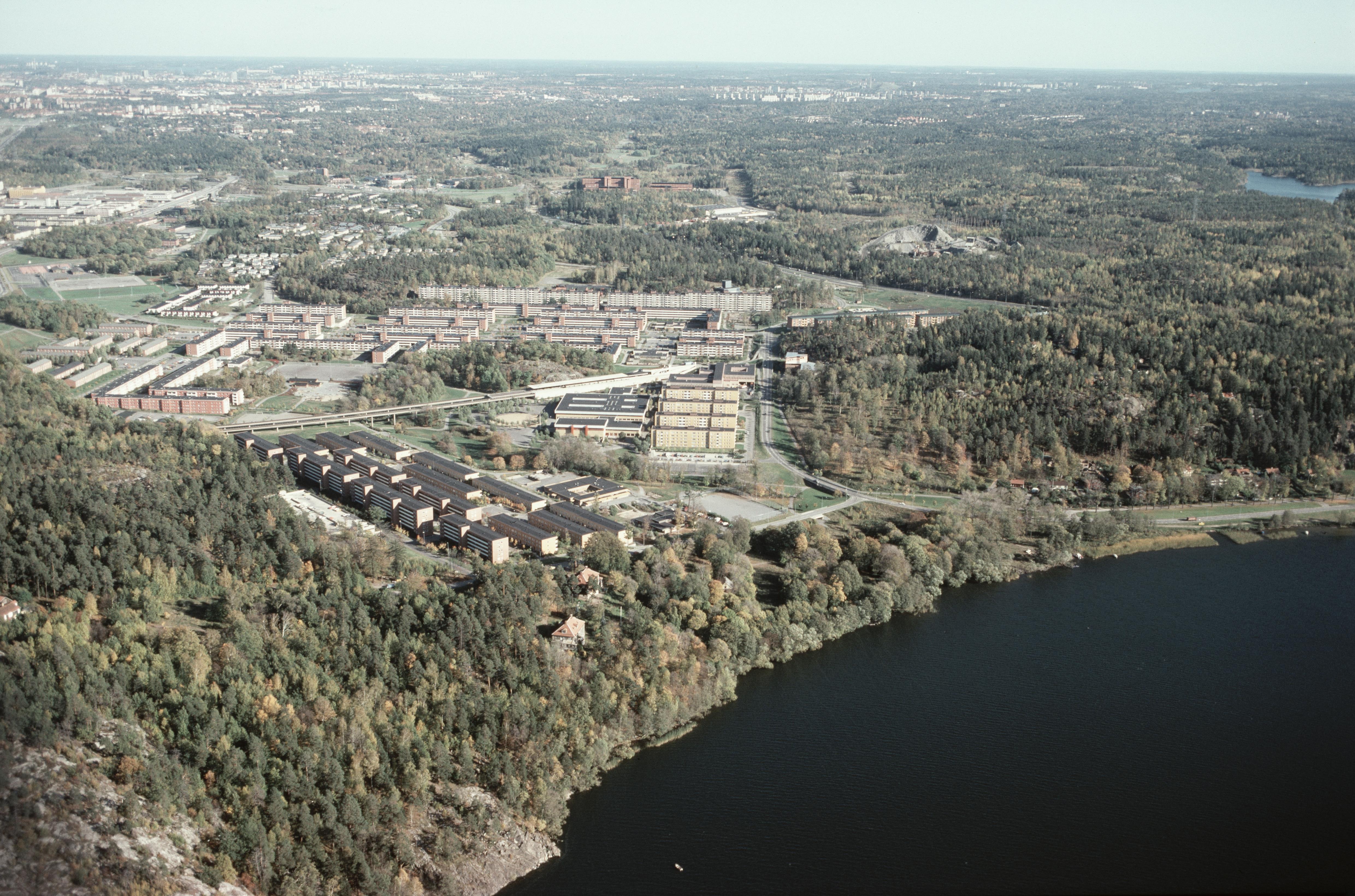 Beskrivning: Bostadsområdet Vårby gård vid Vårbyfjärden i Mälaren. Vid bildens mitt boplats RAÄnr Huddinge 383:1. Vid bildens mitt Huddinge centrum mot Stockholm. Bilden är tagen mot (väderstreck): SO