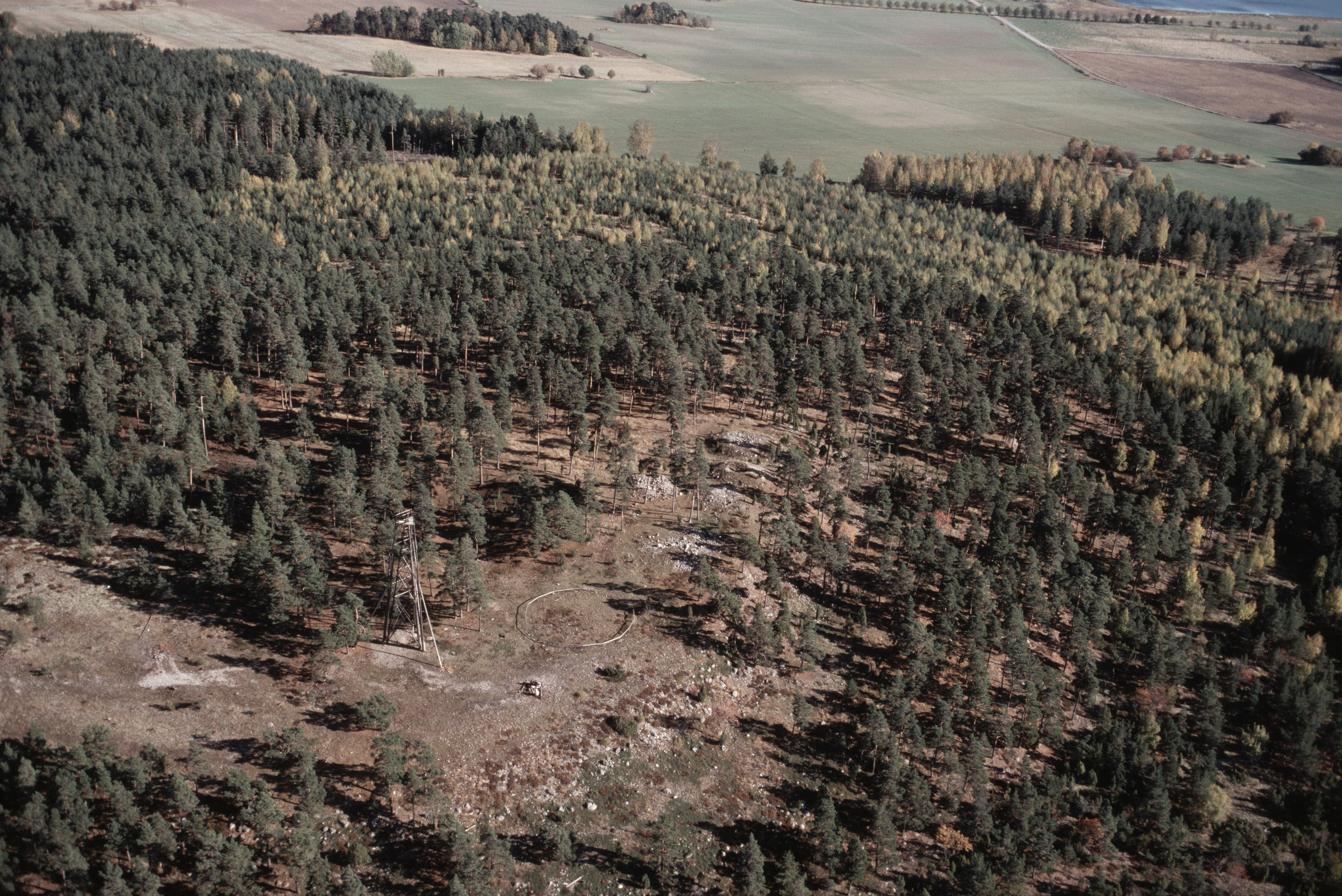 Beskrivning: Rösaringsåsen. Vid bildens mitt labyrint RAÄnr Låssa 24:1 och gravfält Låssa 23:1. Till vänster om bildens mitt södra änden av färdväg (Rösarings processionsväg) RAÄnr Låssa 85:1. Bilden är tagen mot (väderstreck): OSO