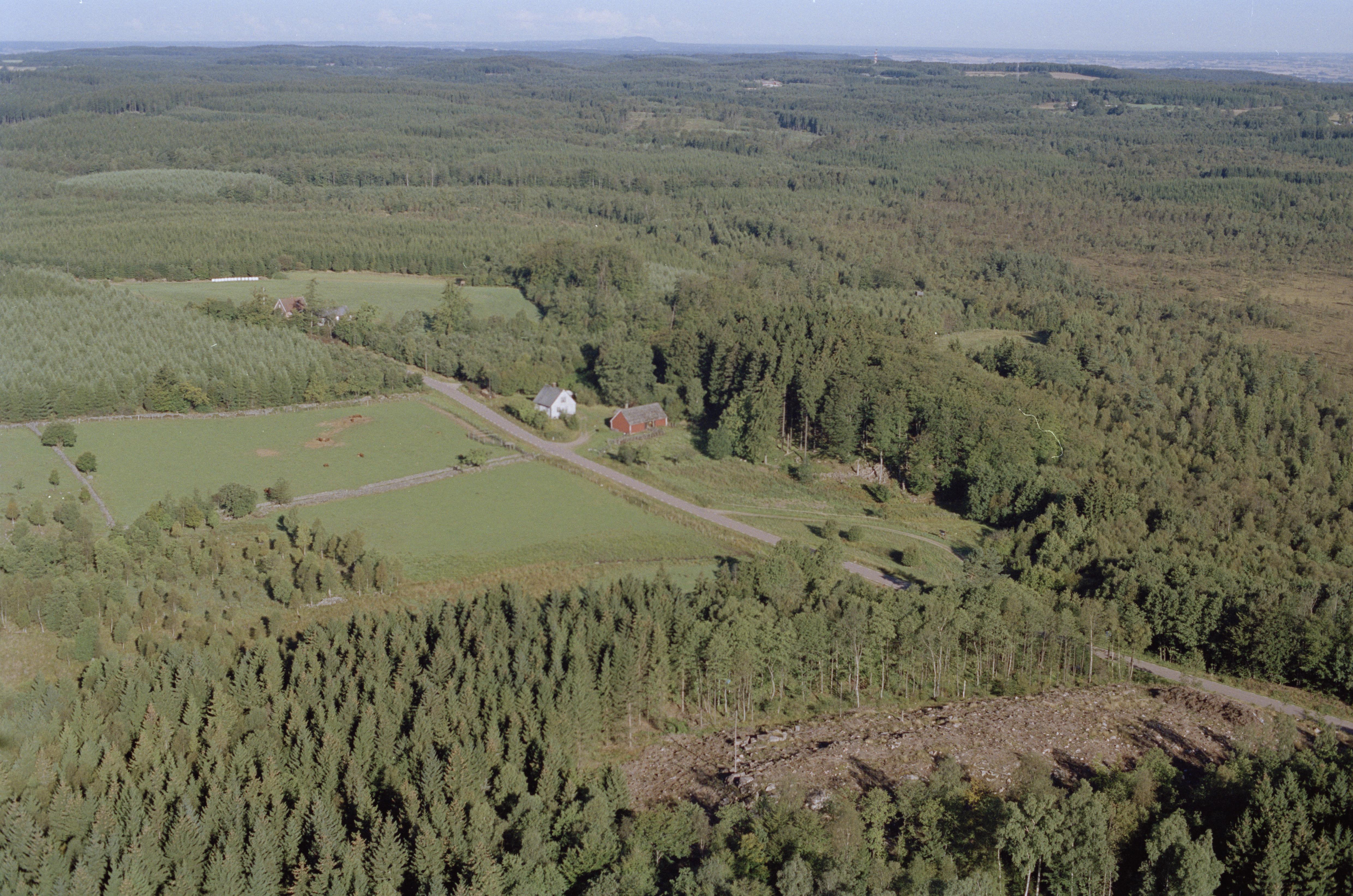Beskrivning: Grindhus gård med omgivande småbrutet odlingslandskap på Söderåsens sluttning. Vid gården fossil åker RAÄnr Konga 240. I bildens övre del Traneröds mosse. Bilden är tagen mot (väderstreck): VNV