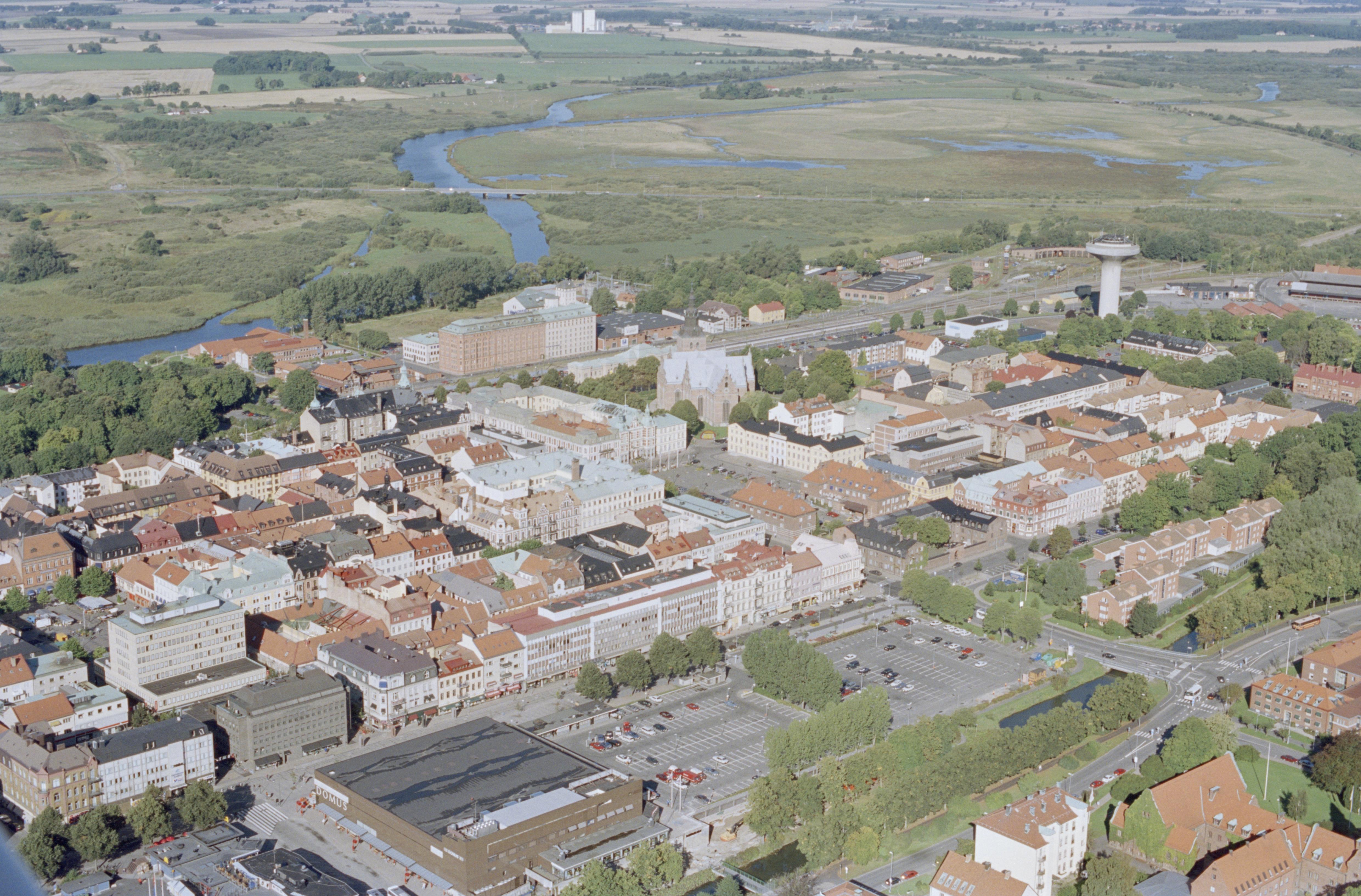 Beskrivning: Anmärkning (övrig): Riksintresse-nr/namn: L15 - Kristianstad. Socken: Kristianstad. Motivering: Fästningsstad och residensstad med rutnätsplan och arkitektur präglad av militär och förvaltning. Ett av de främsta exemplen på den danske kungen Christian IV:s stadsbyggnadskonst, anlagd som gränsfästning mot Sverige. - Uttryck för riksintresset: Stadsplan som genom sin långsträckta, rektangulära form är unik bland landets befästningsstäder. Trefaldighetskyrkan från Christian IV:s tid, bevarade befästningsanläggningar och militära byggnader. Institutionsbyggnader och annan bebyggelse som hör samman med funktionen som residensstad. Äldre småskalig bebyggelse och mer storstadsmässig bebyggelse från 1800-talets slut v(…) Texten i detta fält har förkortats vid migrering till e-arkivet. Se filbilagan extra.xml för fullständig information under note_archivist. Beskrivning: Kristianstads stad. Befästningsanläggning RAÄnr Kristianstad 110:1. Heliga Trefaldighetskyrka vid bildens mitt. Bilden är tagen mot (väderstreck): VNV Fotosyfte: Flygbildsdokumentation