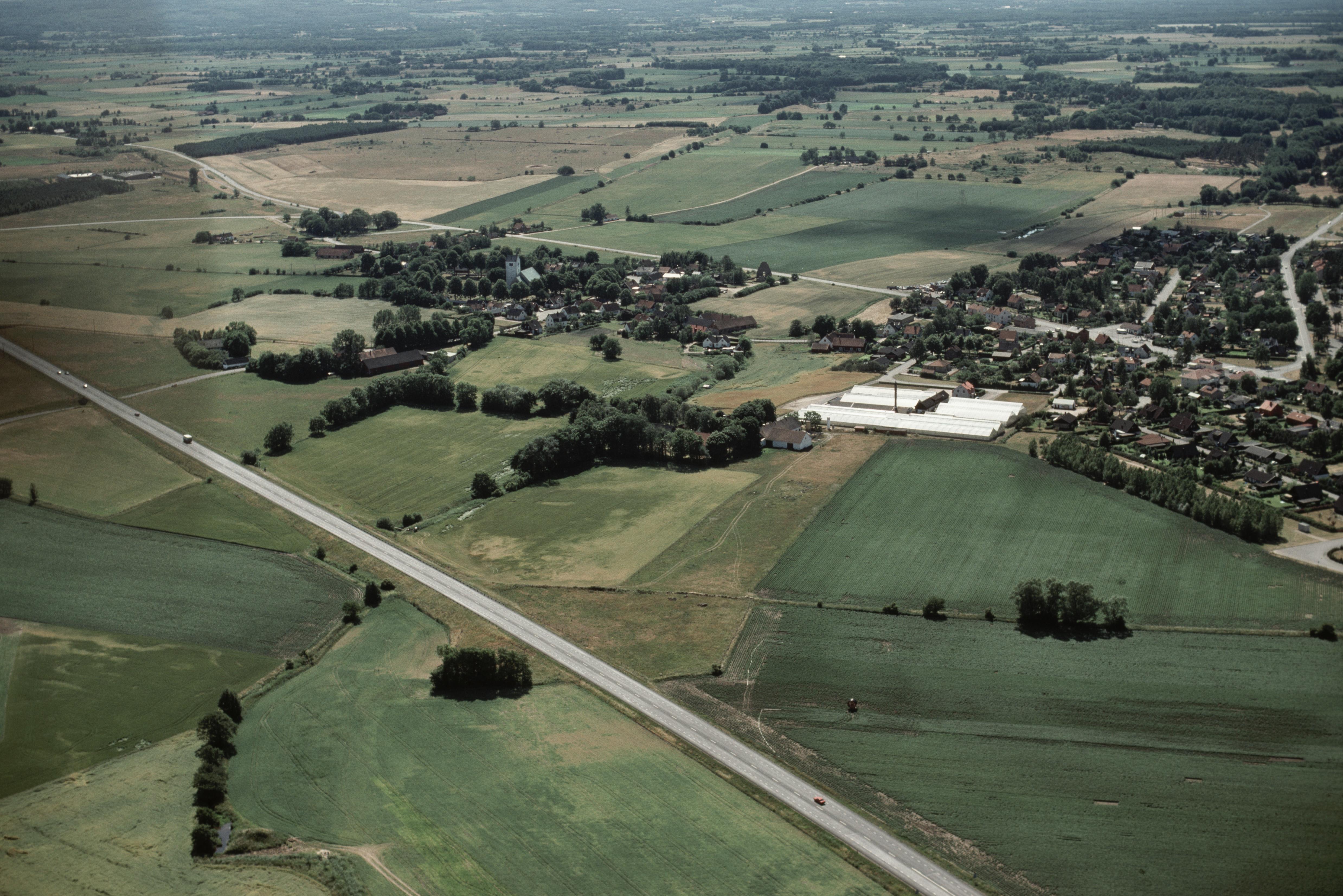 Beskrivning: Vä tätort. Vä kyrka och kyrkoruin RAÄnr Vä 38:1 m.fl. till vänster om bildens mitt. Bilden är tagen mot (väderstreck): VSV