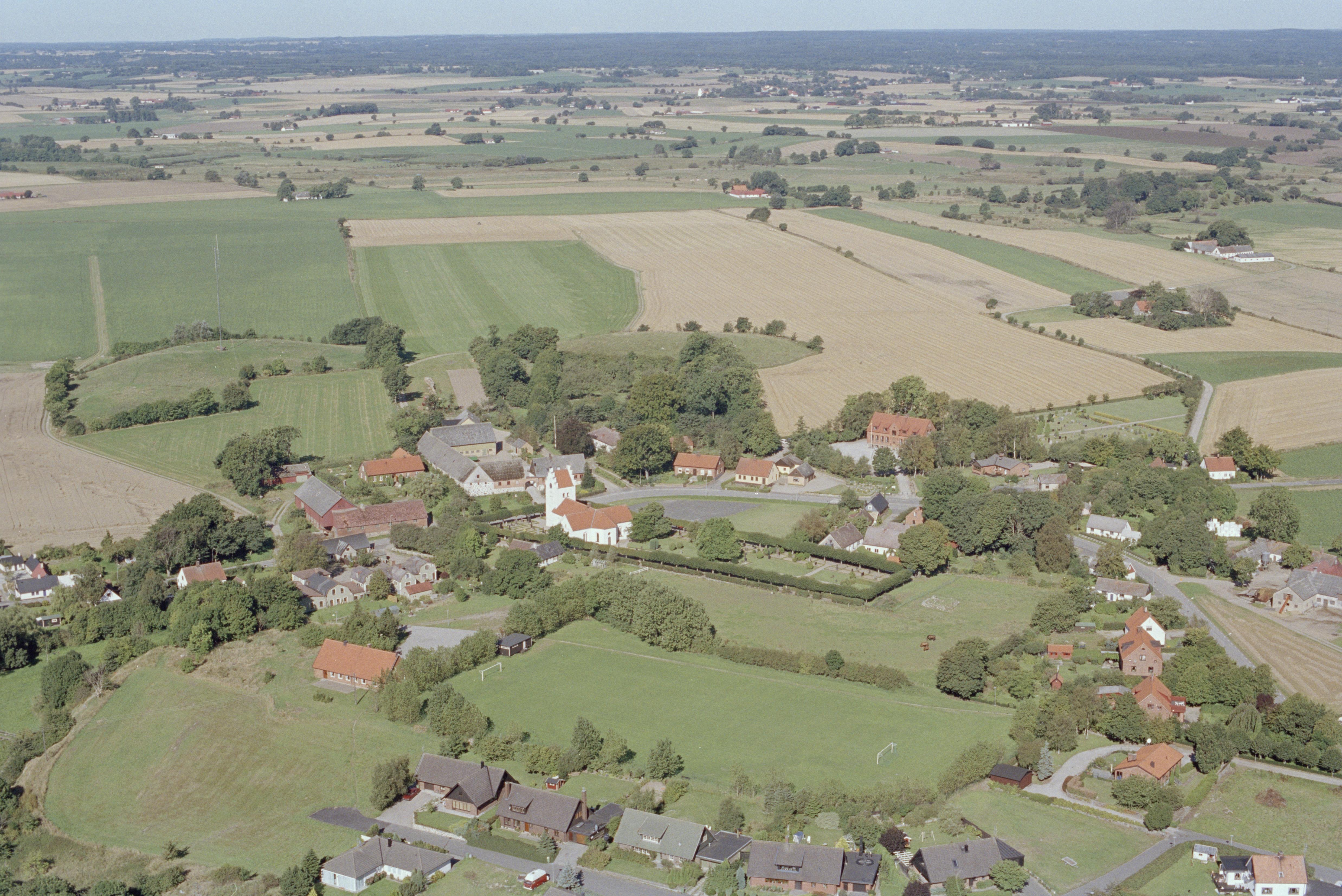 Beskrivning: Gladsax kyrka och kyrkby. Bilden är tagen mot (väderstreck): NV