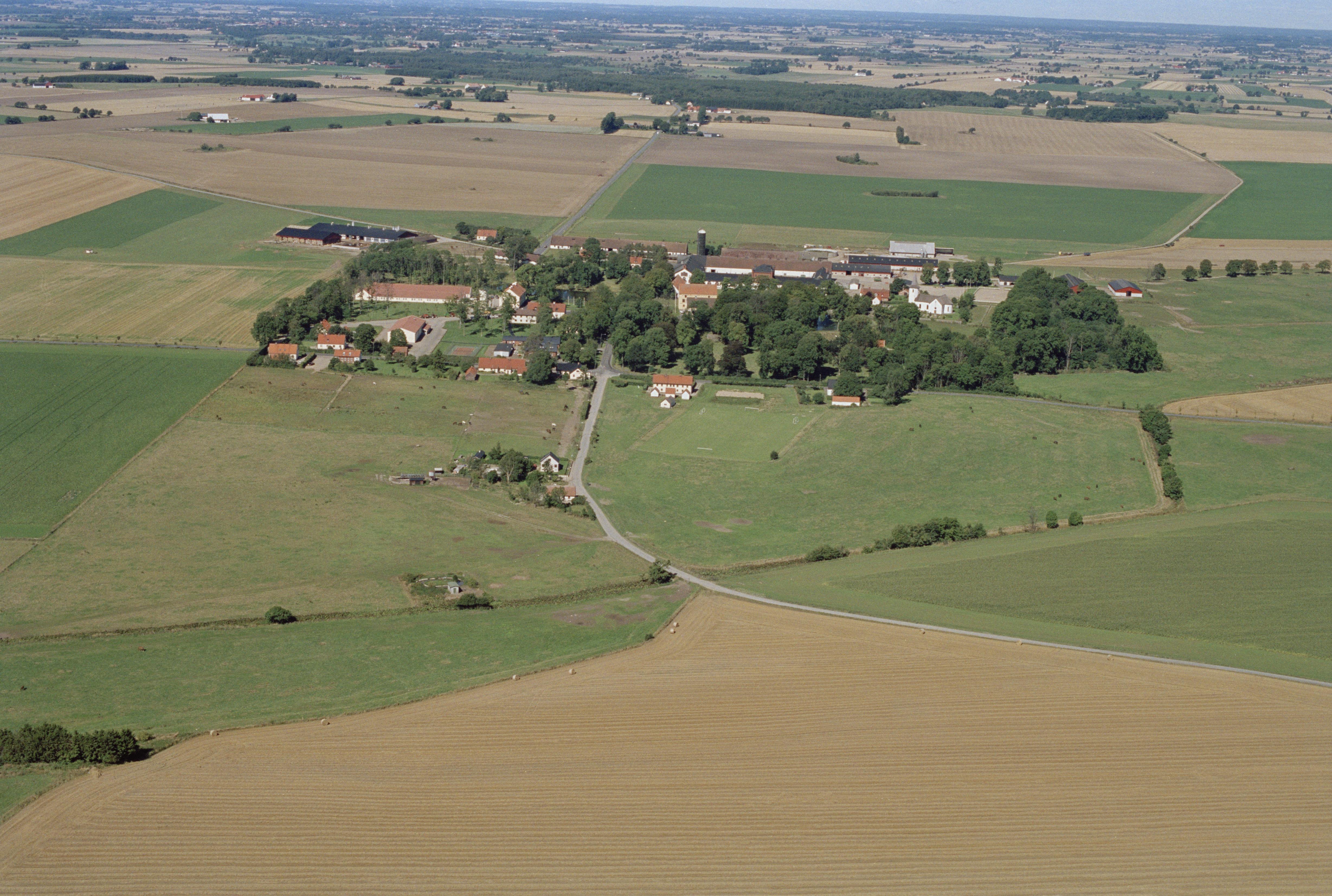 Beskrivning: Bollerups slott (Bollerups borg). Bollerups kyrka till höger om bildens mitt. Bilden är tagen mot (väderstreck): NNV