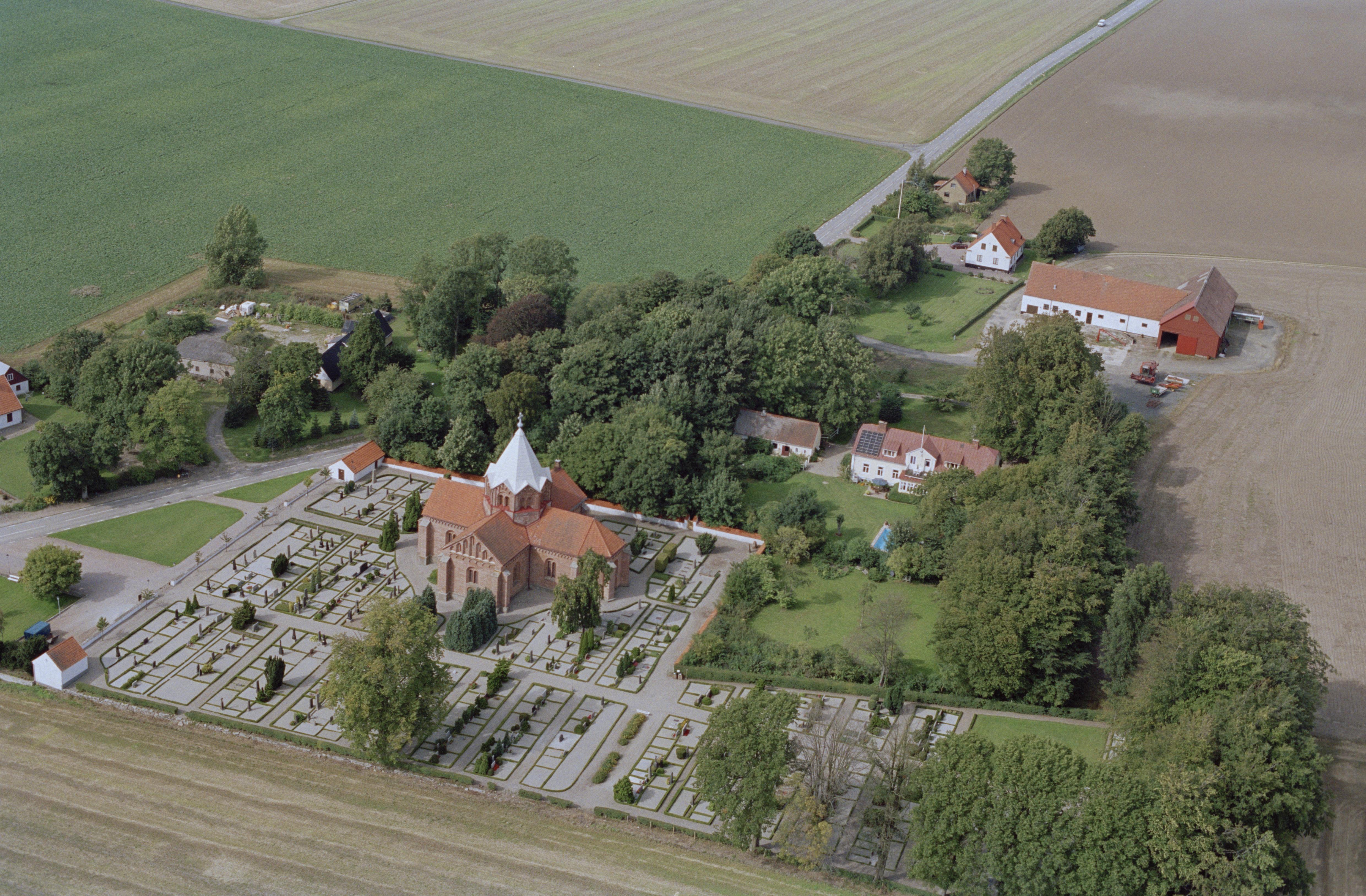 Beskrivning: Tullstorps kyrka och kyrkby. Bilden är tagen mot (väderstreck): NV