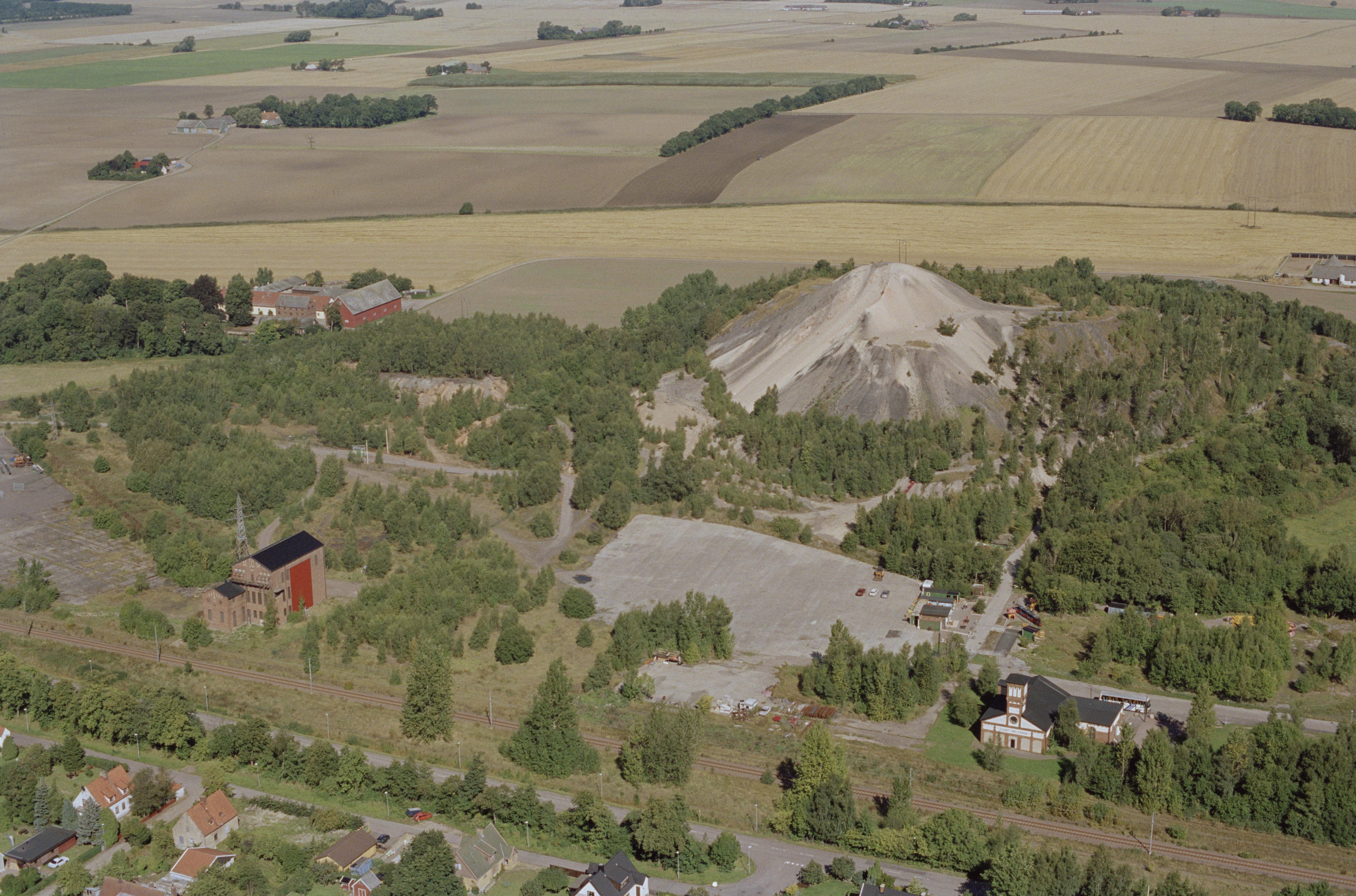 Beskrivning: Västra delen av tätorten Åstorp. Nerlagd stenkolsgruva och slagghög RAÄnr Björnekulla 47. I bildens övre del Ausås socken. Bilden är tagen mot (väderstreck): N