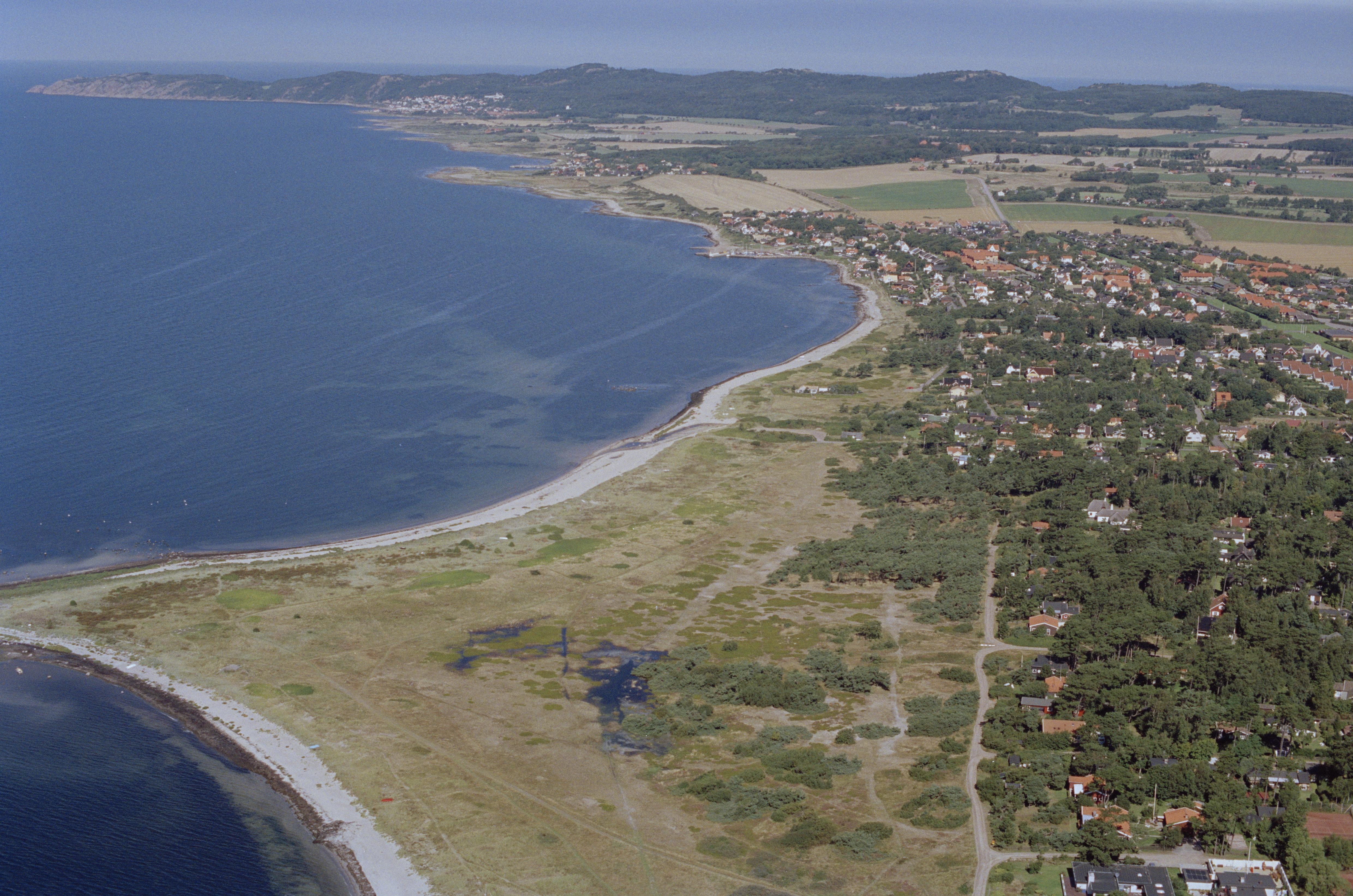 Beskrivning: Anmärkning (övrig): Riksintresse-nr/namn: M1 - Kullaberg. Socken: Brunnby. Motivering: Kustmiljö och odlingslandskap framvuxet ur det forna Kulla fälad med bosättningskontinuitet sedan förhistorisk tid med talrika bevarade fornlämningsmiljöer i ett variationsrikt landskap med sockencentrum, bymiljöer, fiskelägen, badorter och en av landets äldsta, mycket strategiskt belägen fyrplats. Ur främst fiskelägena har successivt samhällsbildningar vuxit fram från tiden sent 1800-tal till tidigt 1900-tal. Krapperups slott av medeltida ursprung och omgivande parker samt den av godsförvaltningen präglade bebyggelsen och odlingslandskapet. (Kommunikationsmiljö, Slottsmiljö). - Uttryck för riksintresset: Fornlämningsrikt om(…) Texten i detta fält har förkortats vid migrering till e-arkivet. Se filbilagan extra.xml för fullständig information under note_archivist. Beskrivning: Bräcke by. I bildens övre del fiskeläget Nyhamnsläge. Bilden är tagen mot (väderstreck): NV Fotosyfte: Flygbildsdokumentation