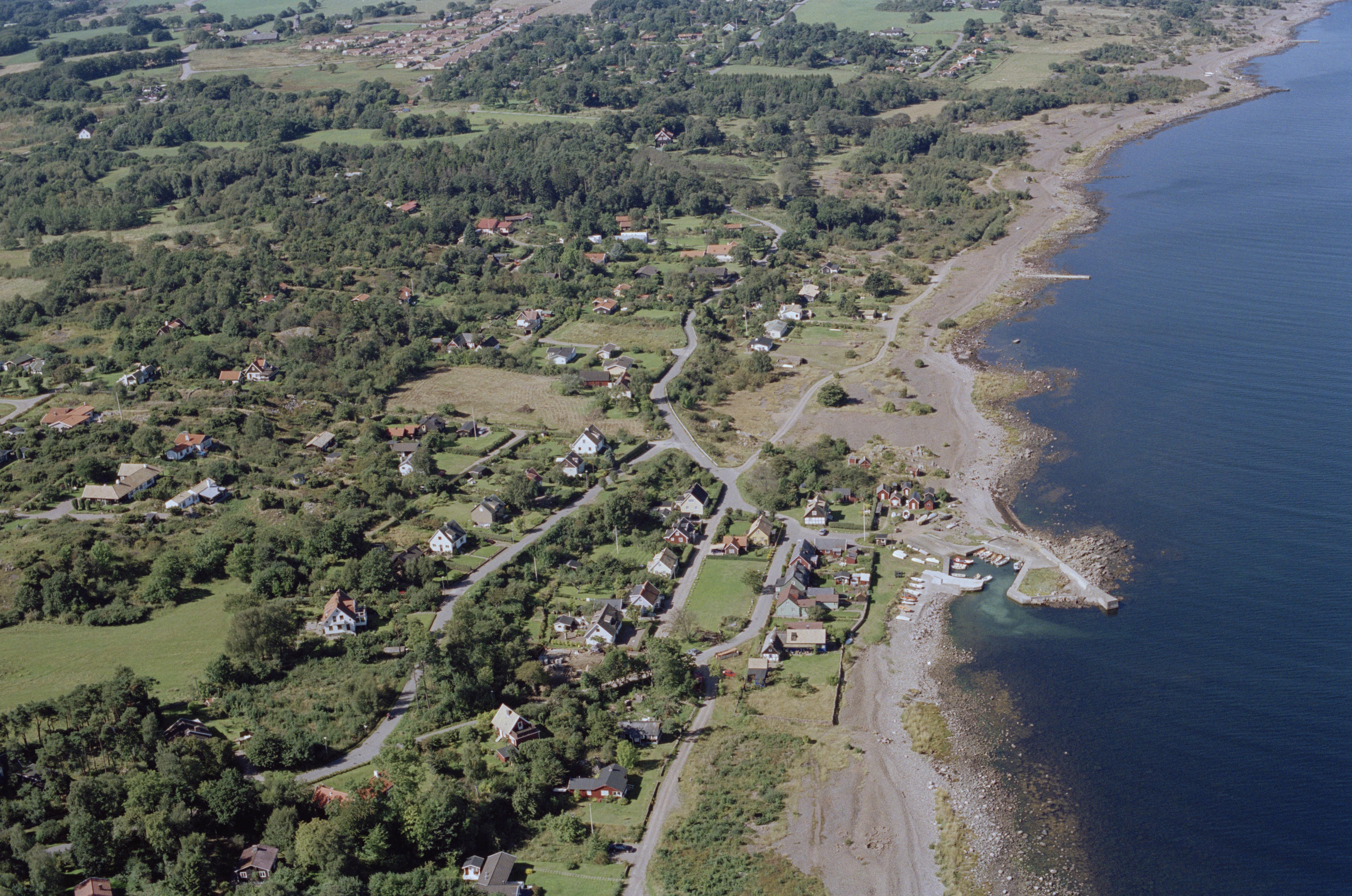 Beskrivning: Skärets fiskeläge, Östra Kullaberg. Boplats RAÄnr Brunnby 105:1 vid bildens mitt. Bilden är tagen mot (väderstreck): NV