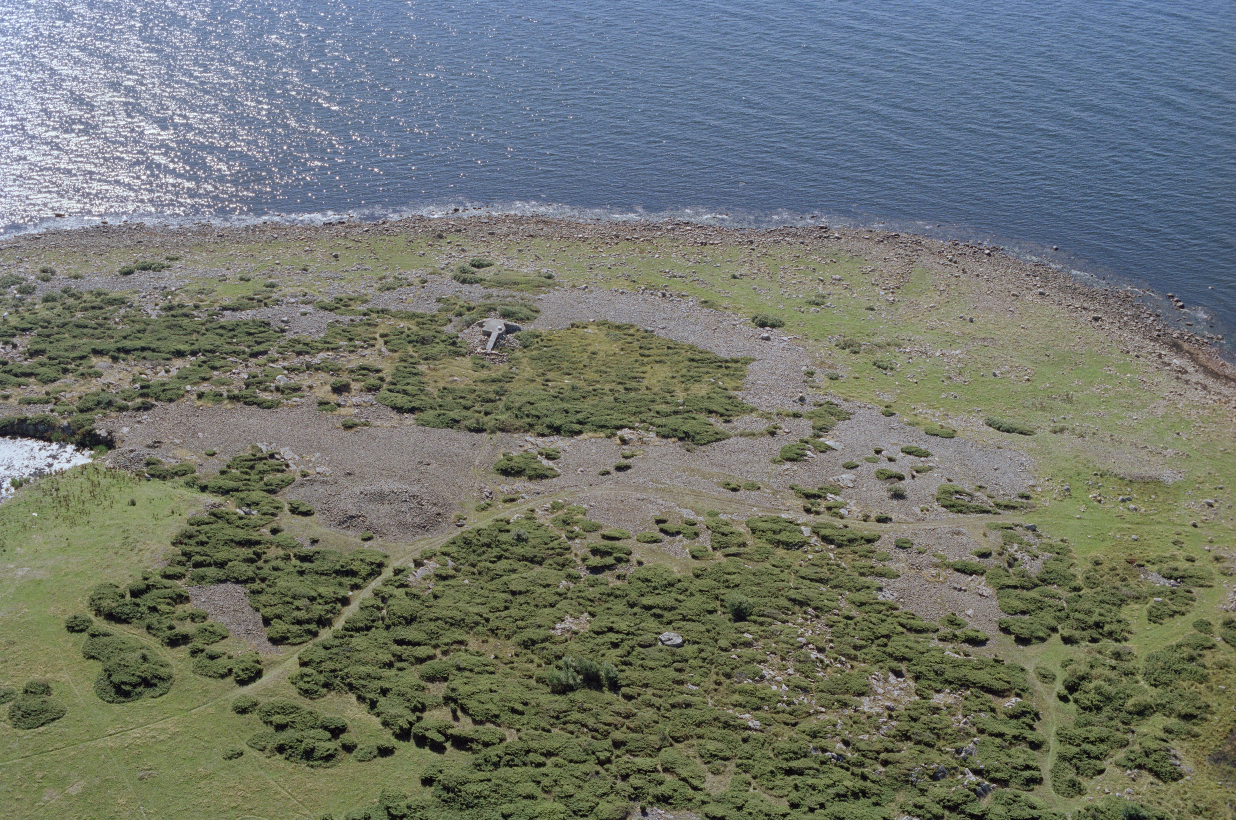 Beskrivning: Bjärekusten / Bjärehalvön. Fornlämningsmiljö vid Dagshög - Burensvik, bl.a. röse RAÄnr Västra Karup 132:1 vänster om bildens mitt. Bilden är tagen mot (väderstreck): SV