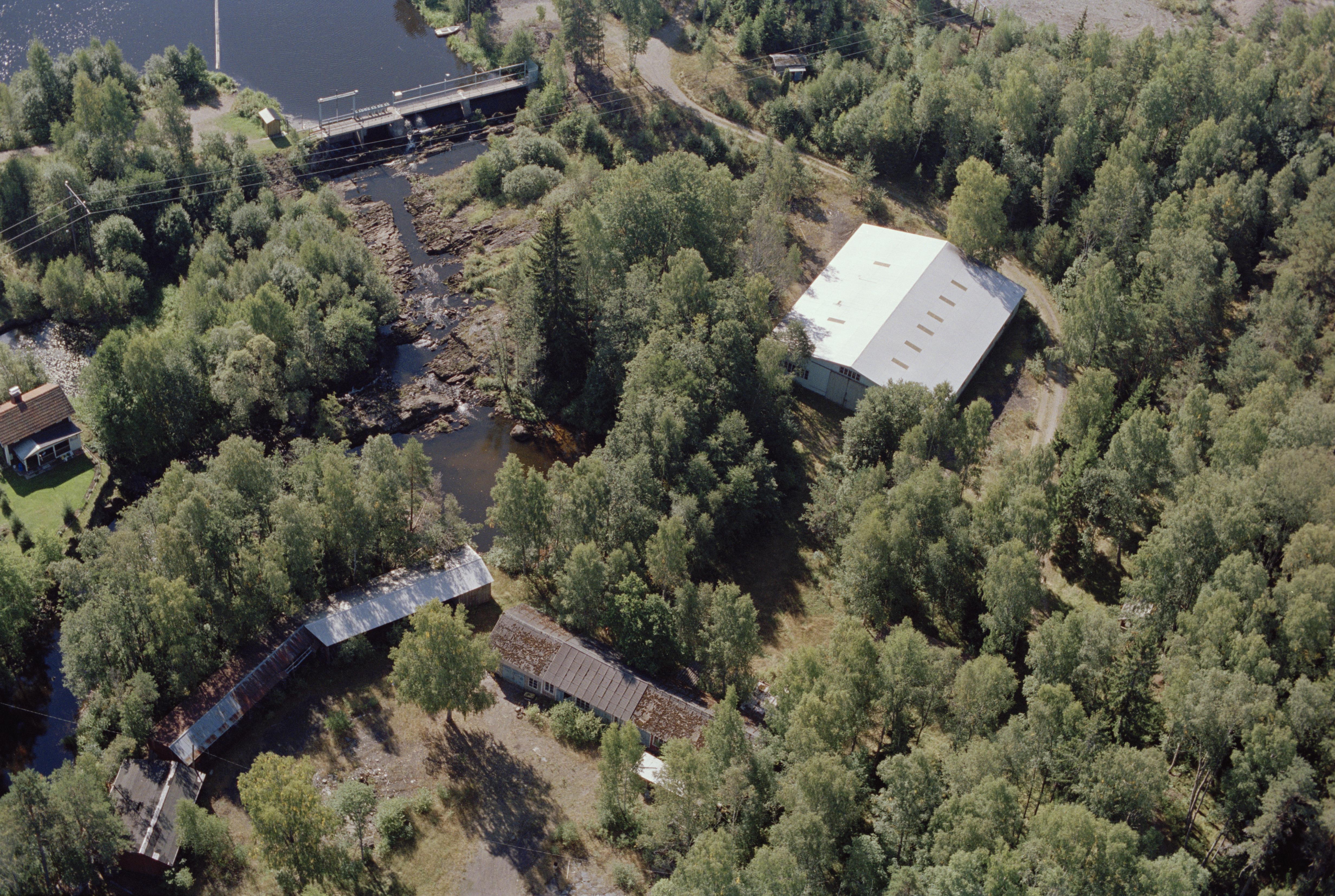 Beskrivning: Ädelfors bruk RAÄnr Alseda 45:1-12 m.fl. Emån vid Ädelfors gruva. Kvarn RAÄnr Alseda 45:7 vid bildens mitt. Uppe till höger området vid hyttlämning RAÄnr Alseda 45:12. Bilden är tagen mot (väderstreck): SV