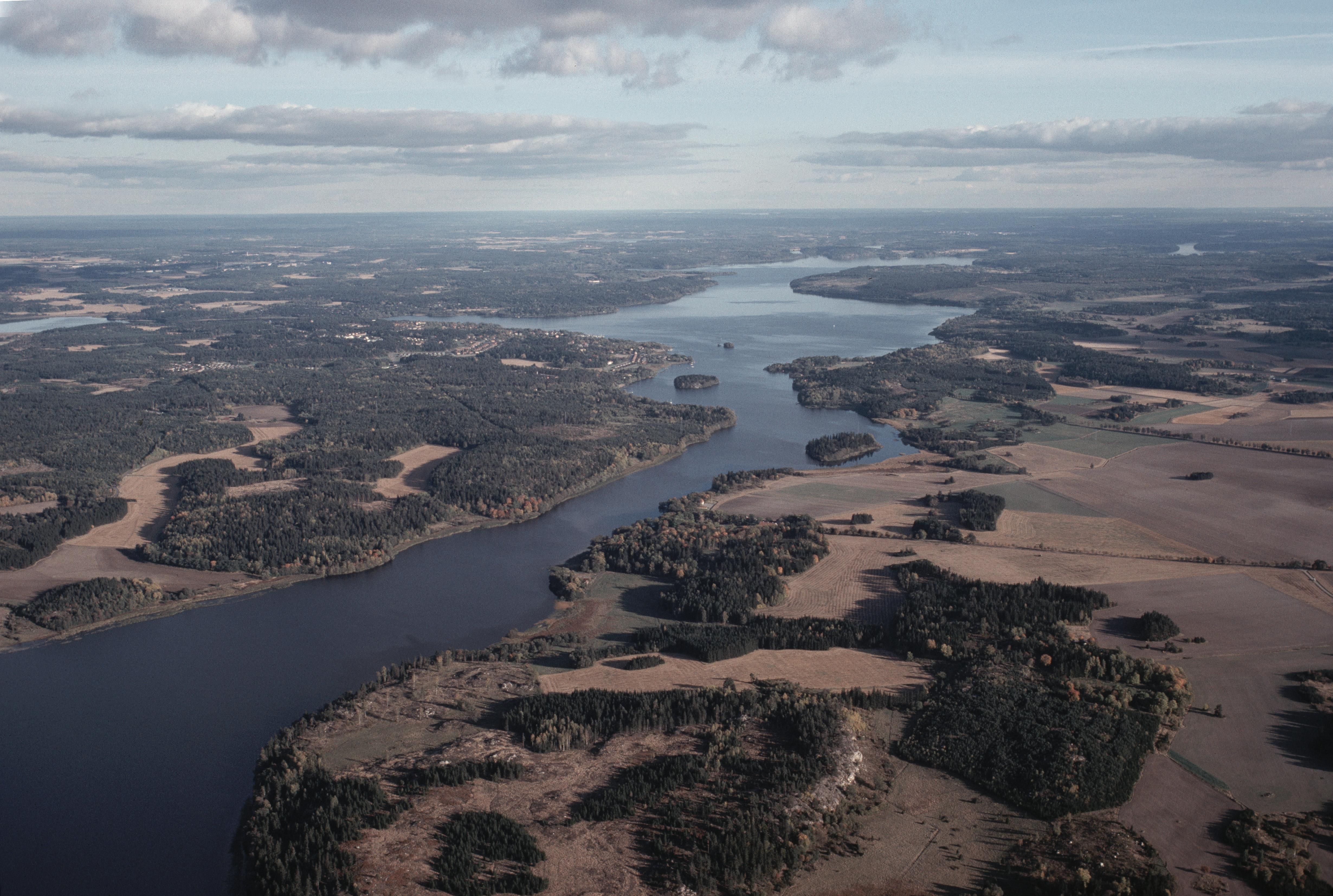 Beskrivning: Vid bildens mitt Signhildsbergs kungsgård med husgrund Fornsigtuna RAÄnr Håtuna 101:1, gravfält Håtuna 99:1 m.fl. vid Håtunaviken, norr om Sigtunafjärden i Mälaren. Uppe till vänster socknet Sankt Per och uppe till höger Håby-Tibble socken. Bilden är tagen mot (väderstreck): SO