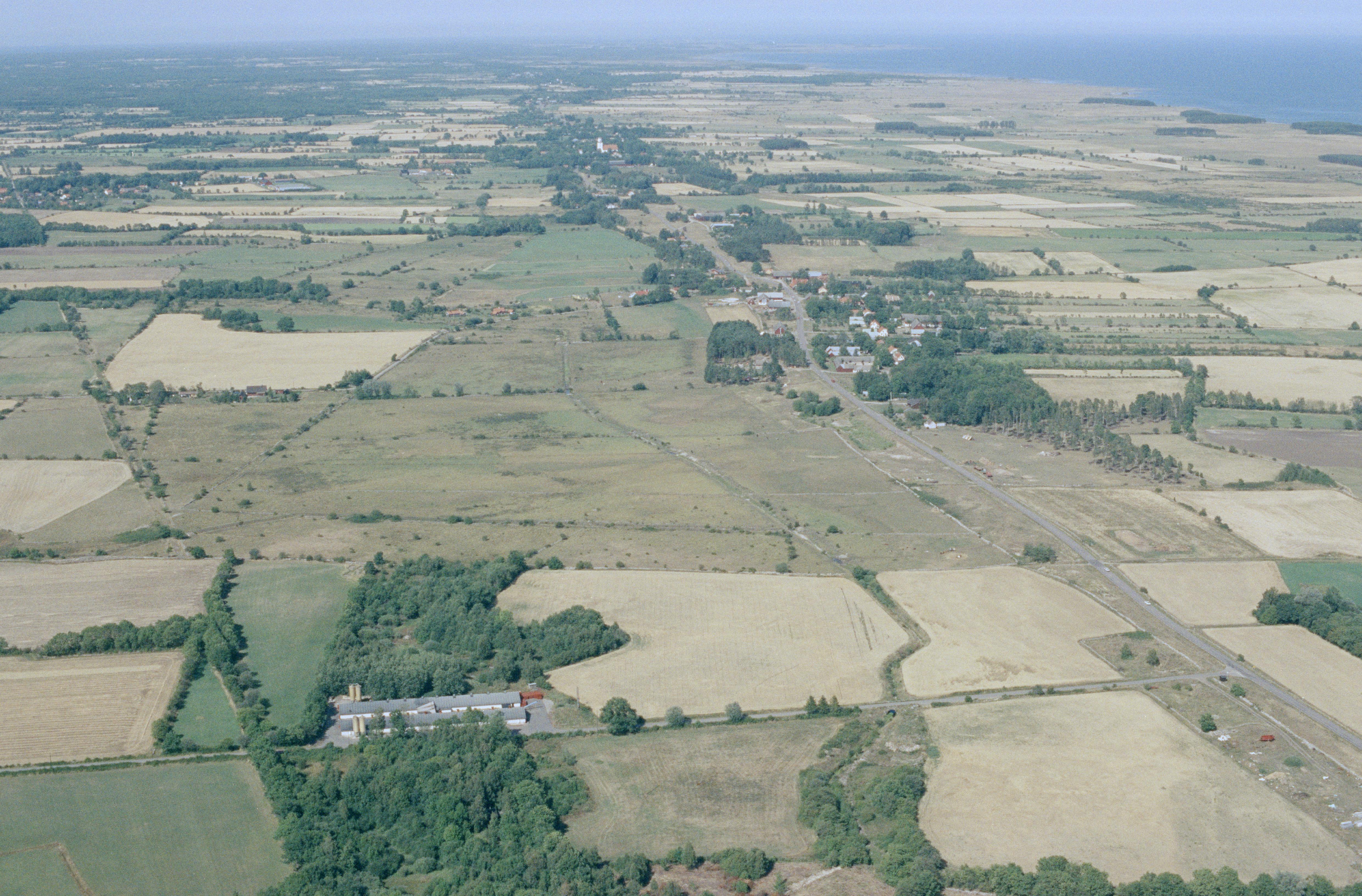 Beskrivning: Runstens kyrka och kyrkby i bildens övre del. Bilden är tagen mot (väderstreck): NO