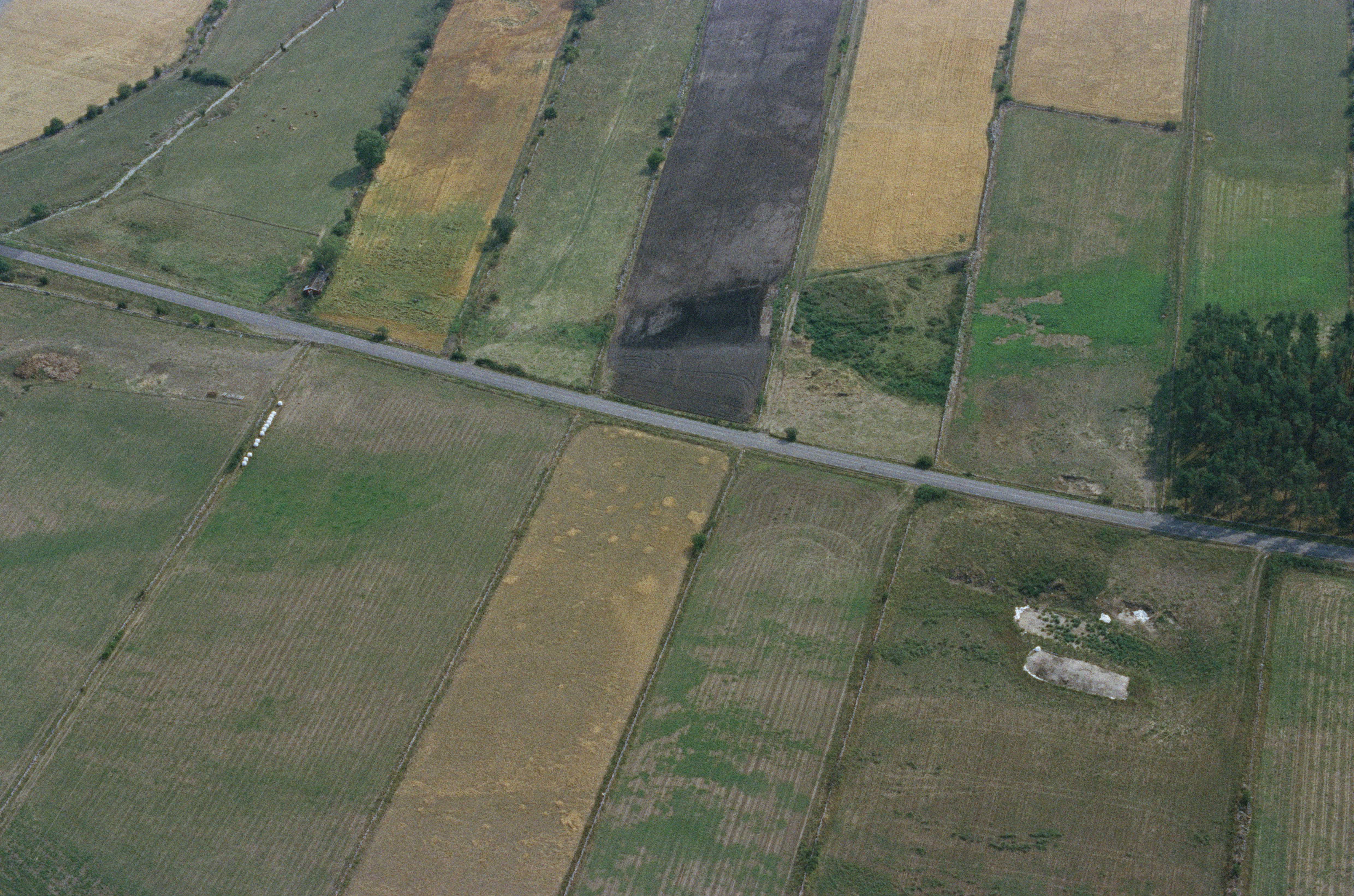 Beskrivning: Cropmarks (härdar?) i åker på fastigheten Bettorp 4:14. I bildens vänstra kant gravplats RAÄnr Norra Möckleby 116:1 och 116:2. Bilden är tagen mot (väderstreck): NO